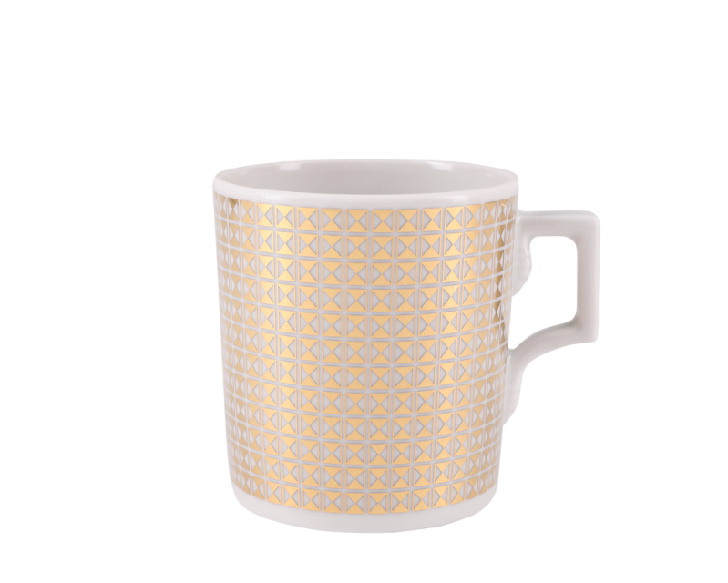 Эффектный декор чайной пары «Зазеркалье. Полосы» разработан художником Инной Олевской. Простые геометрические фигуры, многократно повторенные и строго организованные, составили на фарфоре особую орнаментальную плоскость, напоминающую вход в некую фантастическую страну, в абсурдное Зазеркалье. Серия «Зазеркалье» состоит из 6 чайных пар, декорированных керамическими красками с содержанием драгоценных металлов, золота и платины.