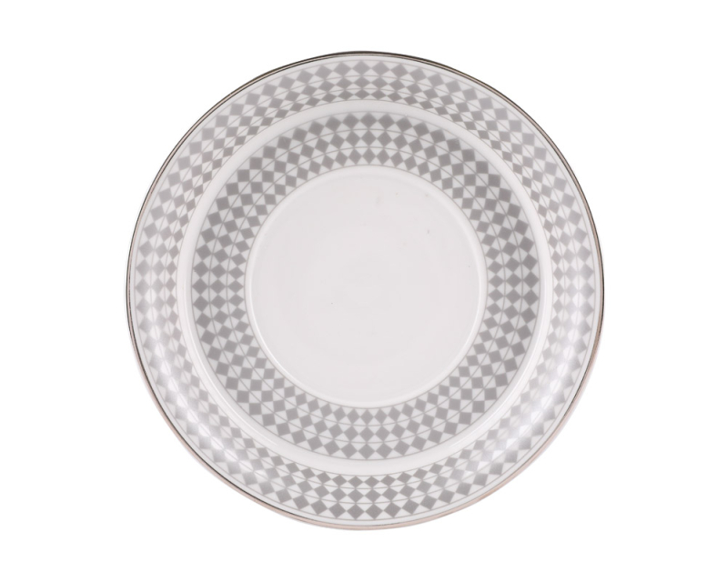 Эффектный декор чайной пары «Зазеркалье. Ромбы» разработан художником Инной Олевской. Простые геометрические фигуры, многократно повторенные и строго организованные, составили на фарфоре особую орнаментальную плоскость, напоминающую вход в некую фантастическую страну, в абсурдное Зазеркалье. Серия «Зазеркалье» состоит из 6 чайных пар, декорированных керамическими красками с содержанием драгоценных металлов, золота и платины.