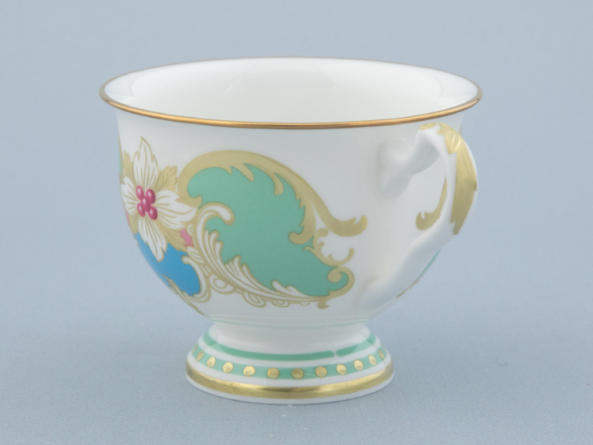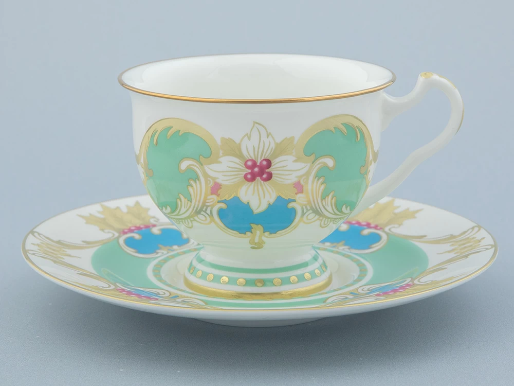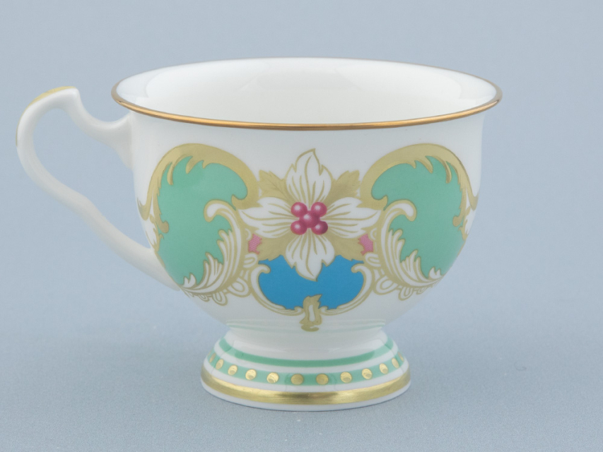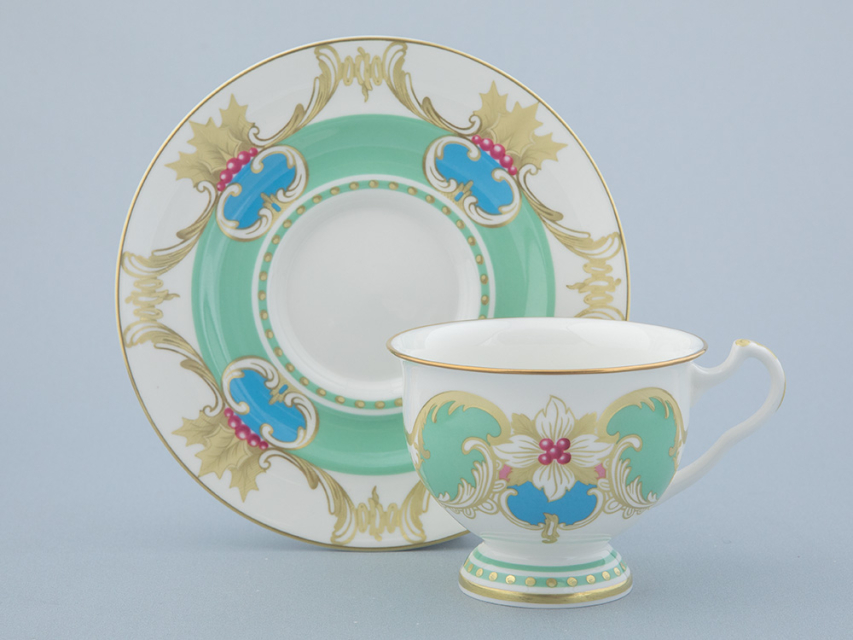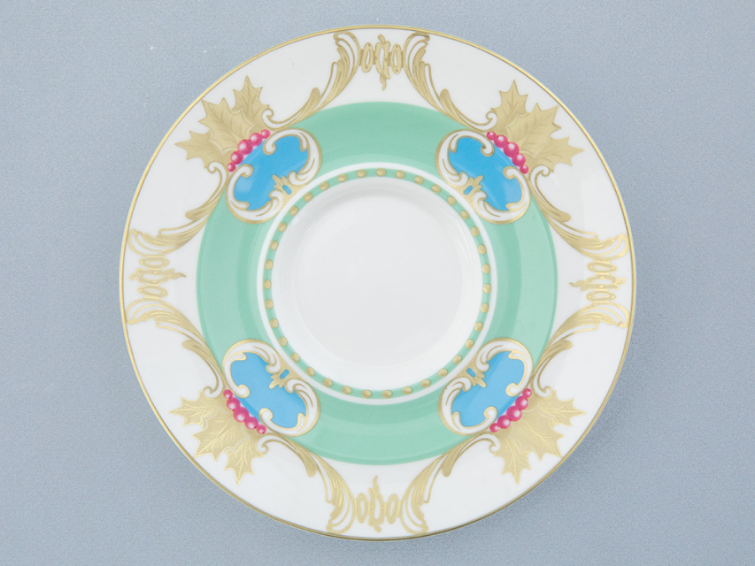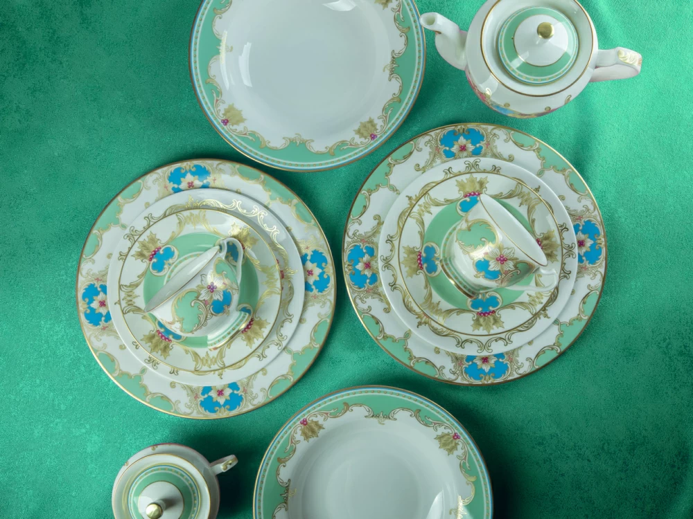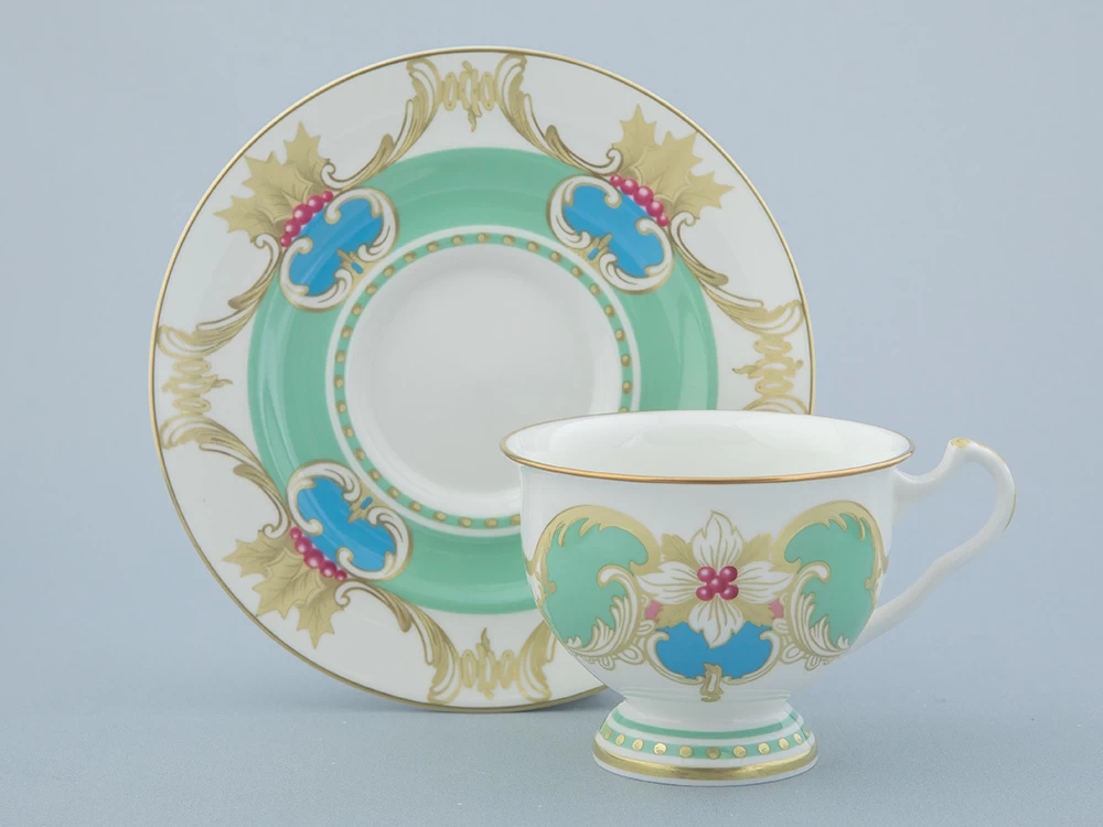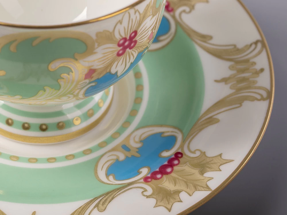 «Аквамарин» - изумительное сочетание белизны костяного фарфора, сервизной формы "Айседора" и роскошной росписи. Основной декоративный мотив – растительная композиция из ветвей и ягод остролиста. Остролист, также его называют падубом, у разных народов символизирует вечность, здоровье и счастье. Это вечнозеленое растение, использовавшееся для украшения еще древними римлянами, и сегодня – один из главных героев новогоднего и рождественского убранства. Одна из важных составляющих декора – гармоничное сочетание цветов. Как и в других своих работах, автор отдает предпочтение благородным, чуть приглушенным натуральным оттенкам. Зеленый цвет символизирует жизнь, небесно-голубой - чистоту и радость, а синий - мудрость и богатство. Такая цветовая палитра с богатой росписью золотом рождает ансамбль, который станет эффектной частью праздничной сервировки.