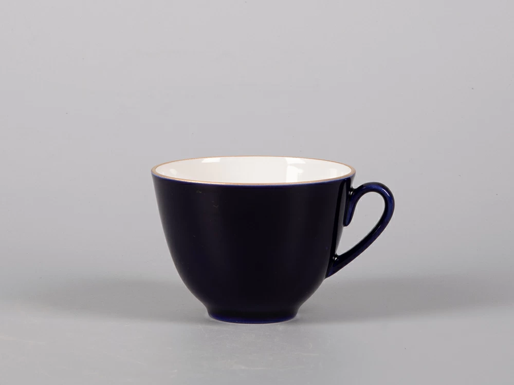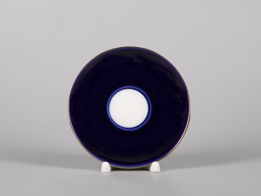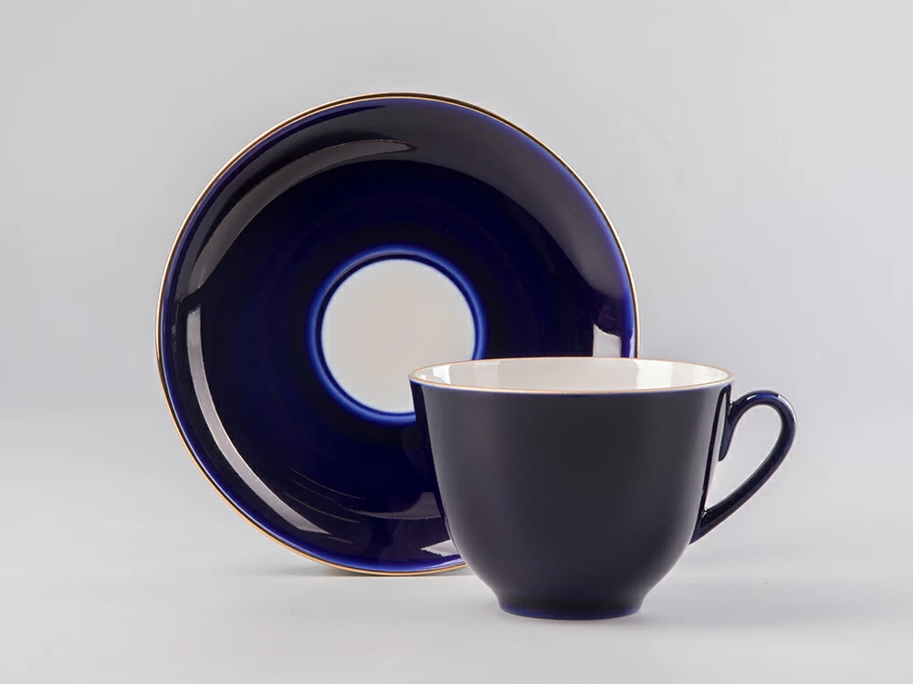 Чашка с блюдцем изготовлена на Императорском фарфоровом заводе (г. Санкт-Петербург) из классического твердого фарфора. Для декорирования используется сплошное кобальтовое крытье и отводка золотом.