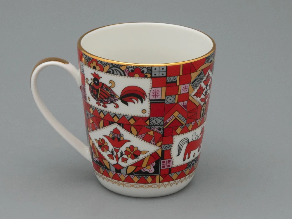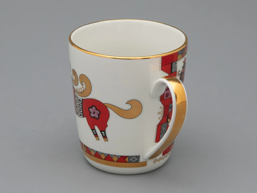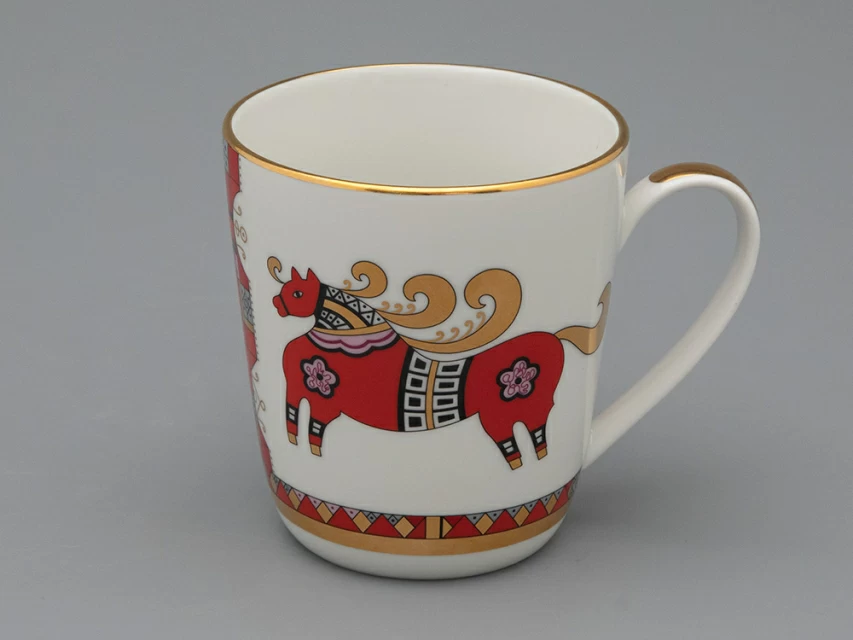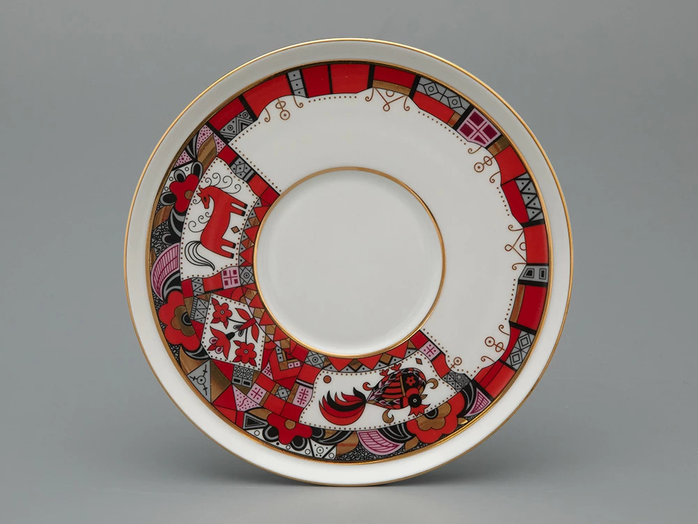Художественное оформление чайной пары выполнено по рисункам выдающегося художника Алексея Воробьевского (1906-1992), творчество которого – это чудесные фантазии, сказочные пейзажи и волшебство. Также художник обращался к нарядным мотивам русского народного искусства, переосмысливал элементы древнерусского орнамента. В результате Алексей Воробьевский разработал собственный самобытный «русский» стиль с яркой цветовой палитрой и точной прорисовкой деталей, что прекрасно демонстрирует рисунок «Красный конь».