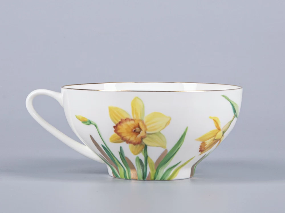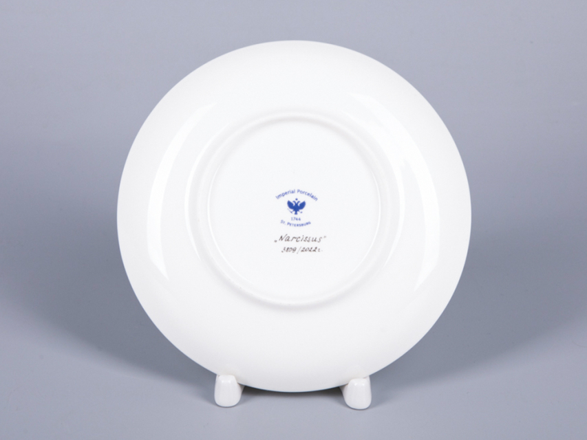 Изделие с рисунком "Narcissus " изготовлено на Императорском фарфоровом заводе из костяного фарфора. Изысканная отводка, нанесенная натуральным золотом, деликатно обыгрывает белоснежную поверхность изделий, дополняет легкий, светлый образ, подчеркивает хрупкость материала, изящную форму предметов.