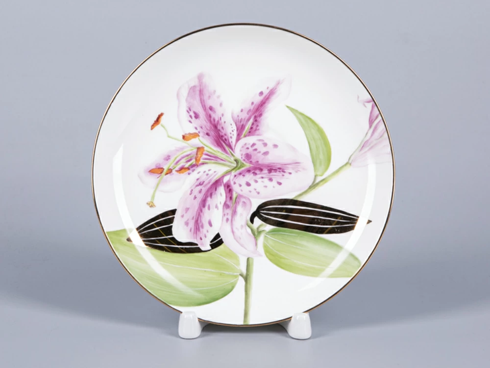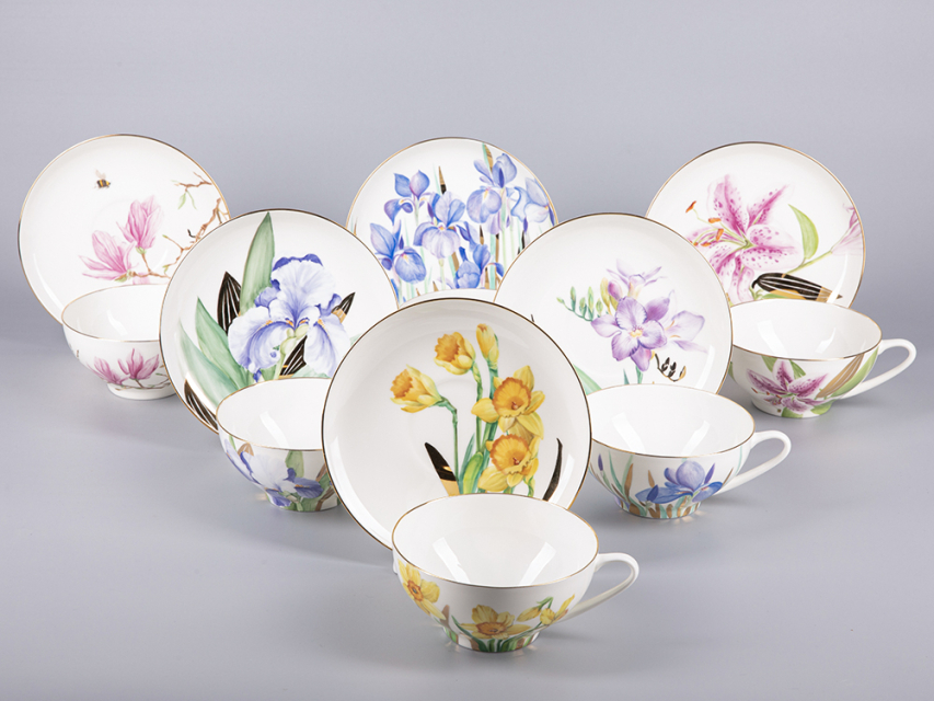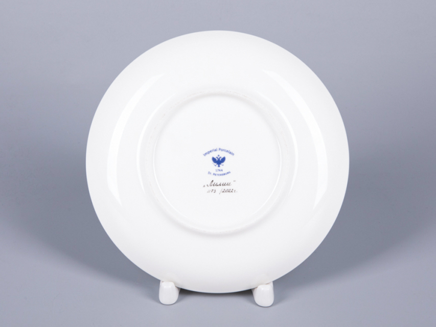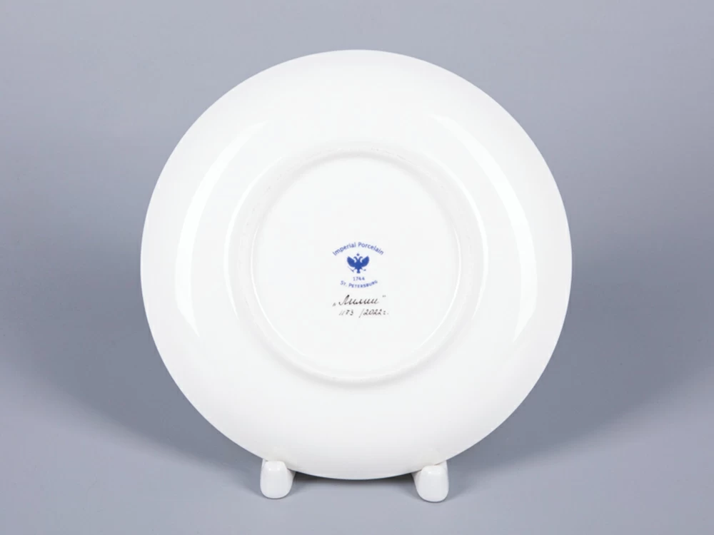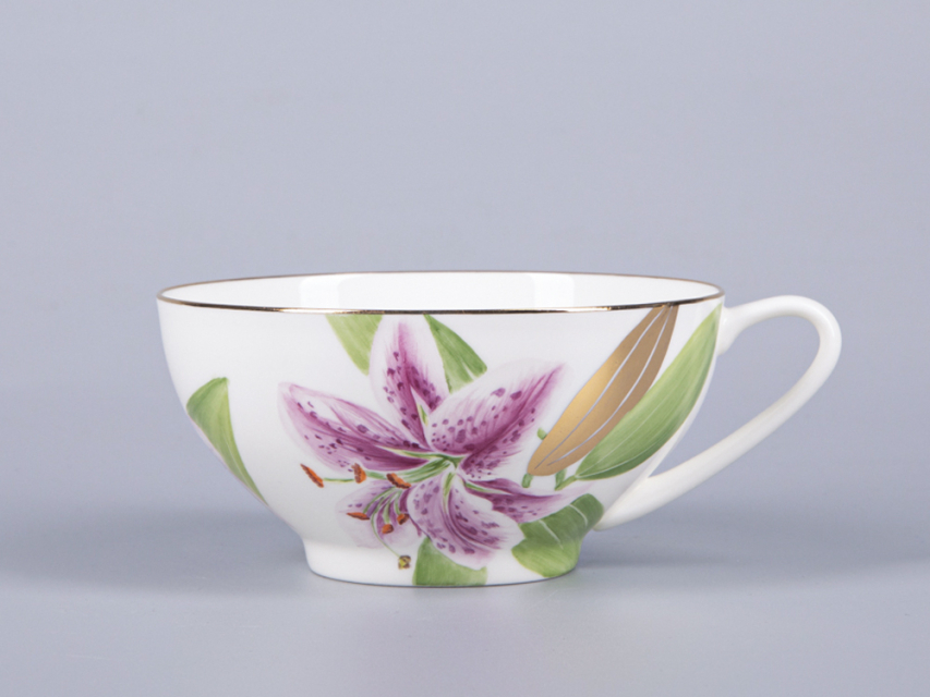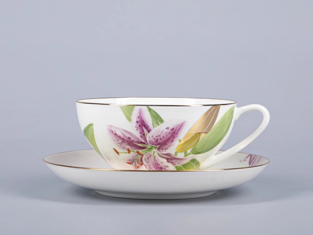 Чайная пара с рисунком "Лилии" изготовлена на Императорском фарфоровом заводе из костяного фарфора. Изысканная отводка, нанесенная натуральным золотом, деликатно обыгрывает белоснежную поверхность изделий, дополняет легкий, светлый образ, подчеркивает хрупкость материала, изящную форму предметов.