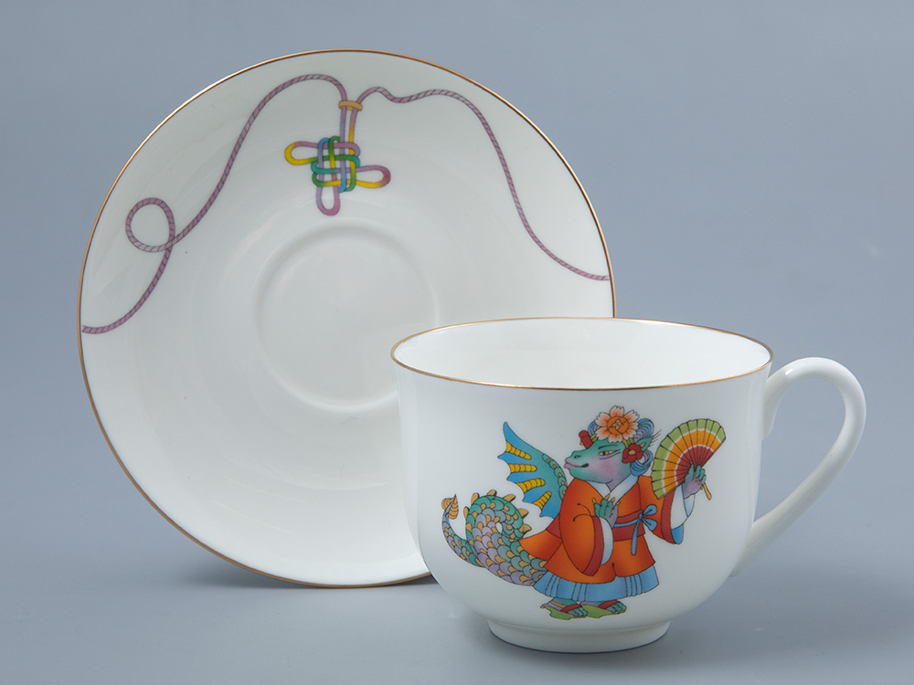 Чайная пара вошла в новогоднюю серию от ведущего художника завода Любови Цветковой. Как и в других своих работах, автор зашифровывает на фарфоре доброе пожелание. Дракончик – красавица Ли облачена в традиционное китайское одеяние Ханьфу. В лапках она держит веер – символ доброты, на блюдце художник изобразила узел-клевер на удачу.