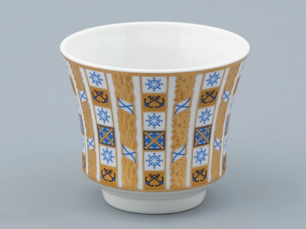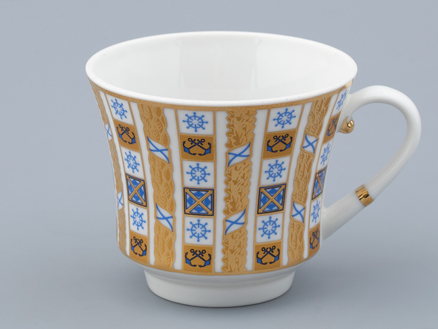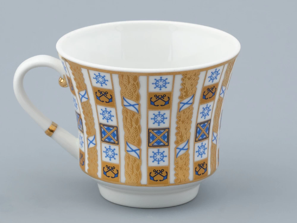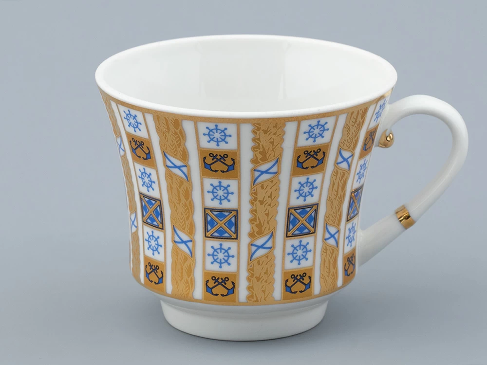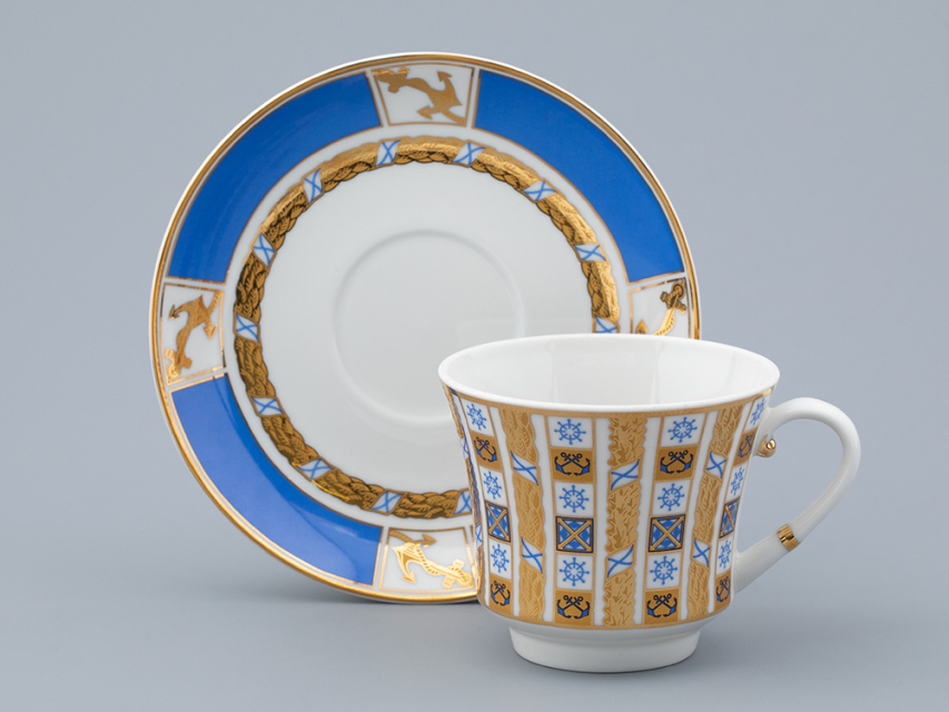 Чайная пара вошла в коллекцию, посвященную 320-летию Кронштадта. Декор, созданный художником Владимиром Богдановым, напоминает о значении города и его историческом наследии – Кронштадту было суждено стать родиной российского флота. Чайная пара украшена повторяющимся орнаментом из морской атрибутики и символов ВМФ: якорей, штурвалов и Андреевского флага.
