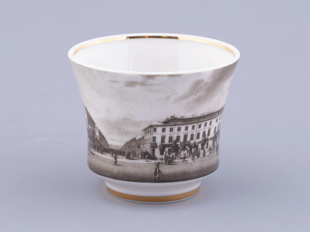«Великолепный Невский» – настоящая ода главной улице Северной столицы и возможность перенестись в Петербург начала XIX века. На поверхности чашки Сергей Русаков сочетает литографию, выполненную по восхитительным акварельным панорамам В.С. Садовникова – с историческими зданиями, крохотными вывесками и спешащими по своим делам прохожими. На блюдце художник располагает карту Петербурга начала 1840-х гг.