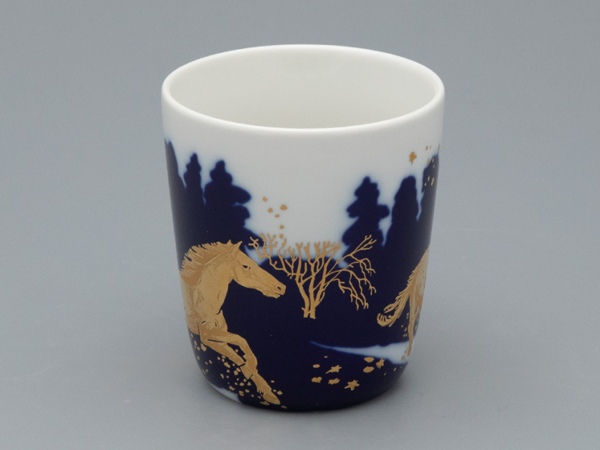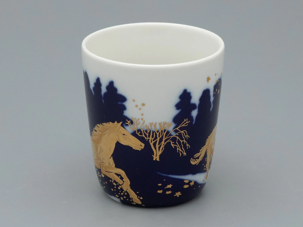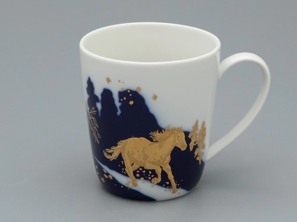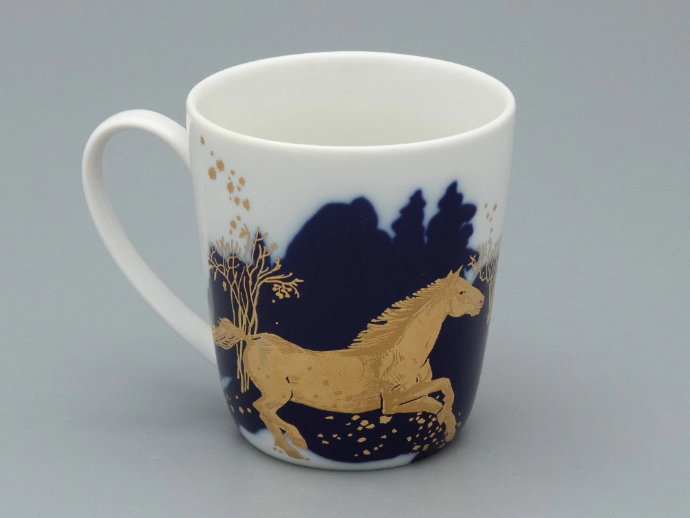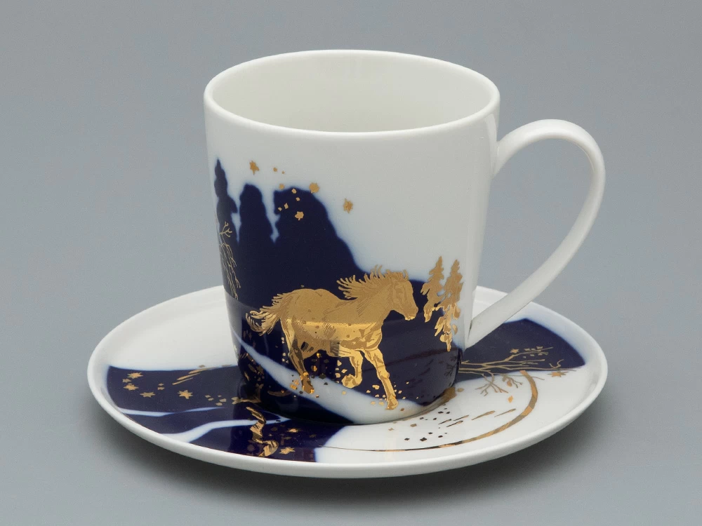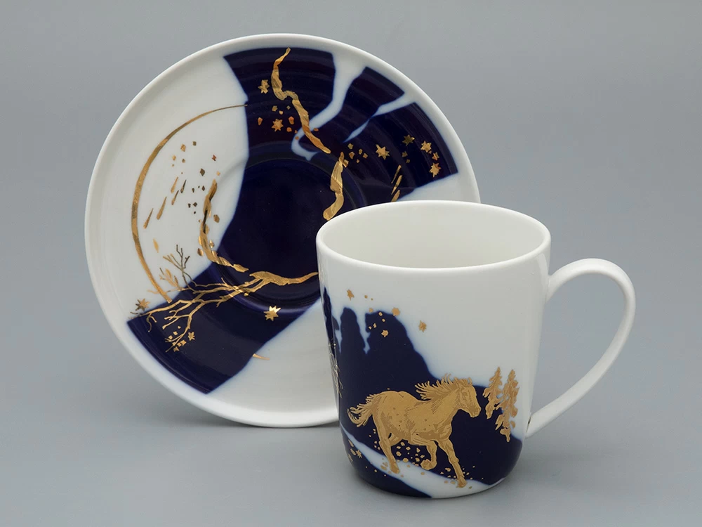 Нелли Петрова создает на чайной паре картину зимнего пути, где скачет свободолюбивая лошадь. Через ее бег художник выражает эмоциональную метафору – стремление к свободе, счастью и дерзким мечтам. Используя традиционное для Императорского фарфора сочетание глубокого кобальта и мерцающего золота, Нелли Петрова создала проникновенную лирическую композицию. Тонкое исполнение деталей и глубокое понимание образа позволяют зрителю очутиться в атмосфере морозного дня, почувствовать дуновение ветра и ощутить ритм скачущей лошади.