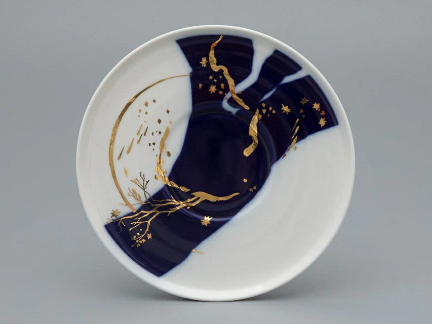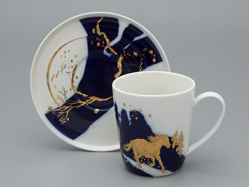 На чайной паре автор изображает горделивого алого коня на фоне бескрайнего звездного неба. Выразительный окрас скакуна и его золотая грива олицетворяют энергию огня, мощь и силу жизни. Рисунок становится своего рода посланием: «Стремитесь вперед и верьте в собственные силы!», – пожелание, особенно актуальное в преддверии праздников.
