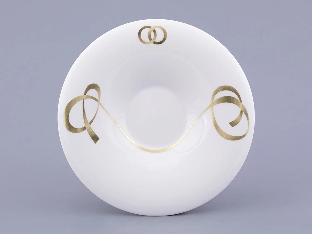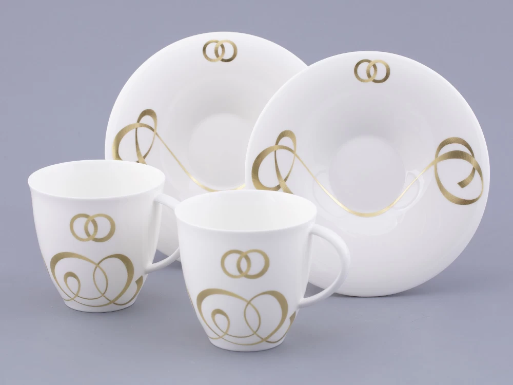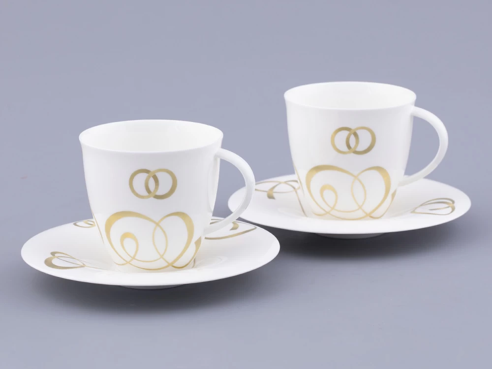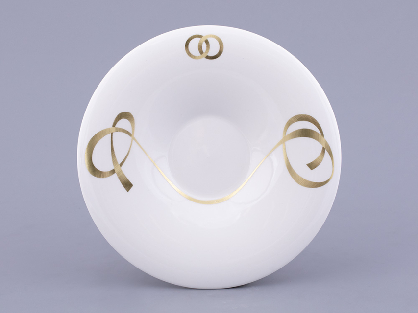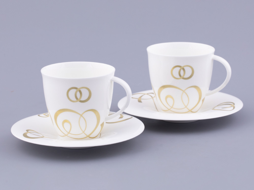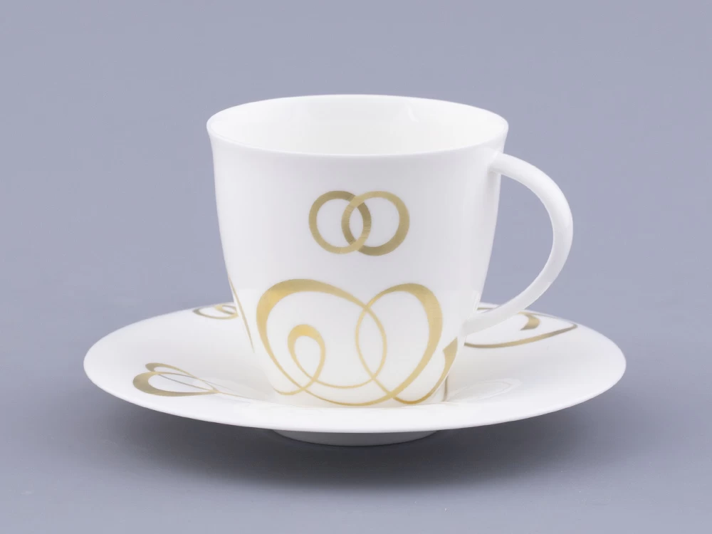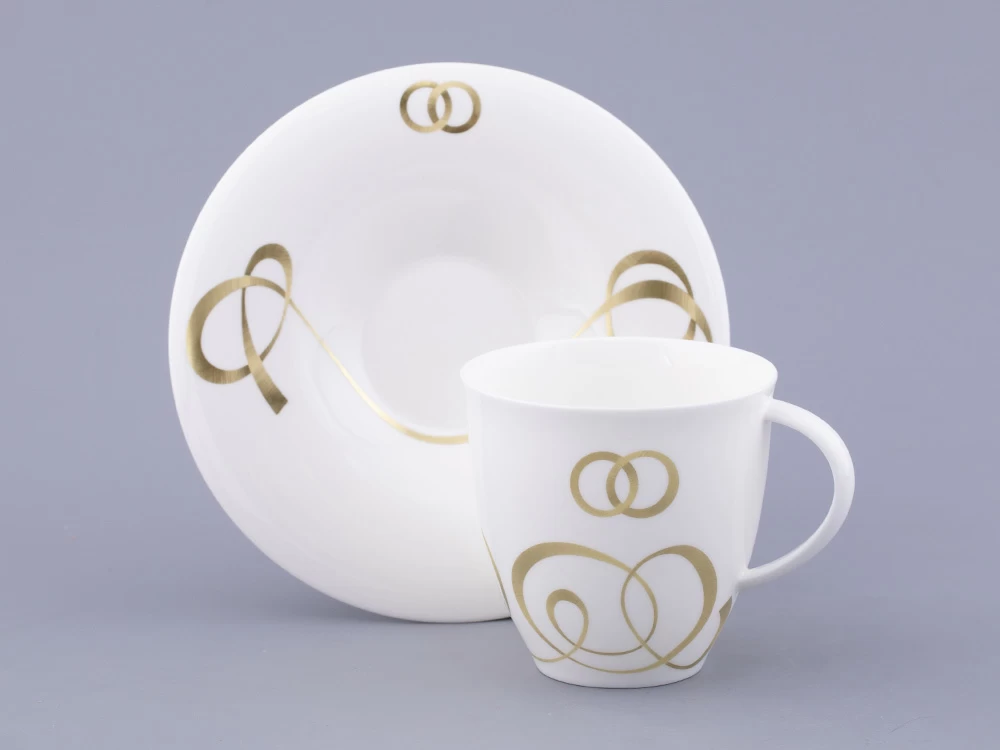 Декор чайной пары «Колечки» художник Нина Троицкая посвятила обручальным кольцам. Пожалуй, именно обручальные кольца являются самым узнаваемым символом брака, бесконечности и единения двух душ во всем мире, а традиция обмениваться кольцами укоренилась в обычаях многих народов. Особое внимание уделялось металлу, из которого изготавливались кольца. Самый популярный – золото – символ крепких отношений, любви и верности.