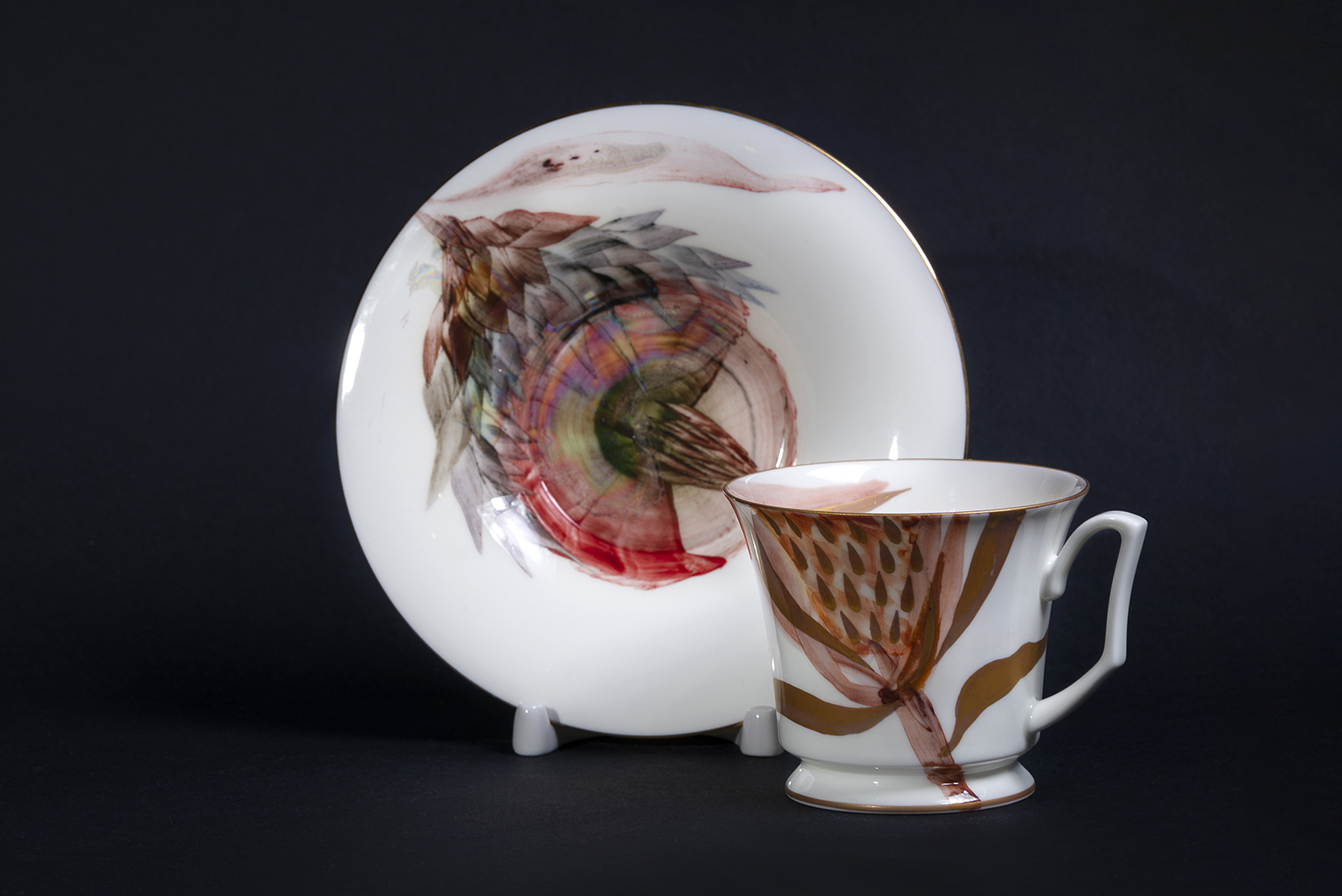 Растительная тематика – одна из любимых в творчестве Татьяны Чапургиной. Чайная пара вошла в серию «Русские обочины», которую художник посвятила разнообразию отечественной флоры Неприхотливые растения, среди которых – степная колючка и репейник, растущие по обочинам и на пустырях, стали главными героями серии. Чайная пара выполнена из тонкостенного костяного фарфора. Он производится из массы, в состав которой входят фосфаты кальция. От обычного фарфора его отличает повышенная белизна, тончайший слой глазури, и та воздушность, которая была свойственна знаменитому сорту старинного китайского фарфора под названием «яичная скорлупа». |