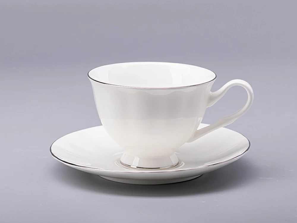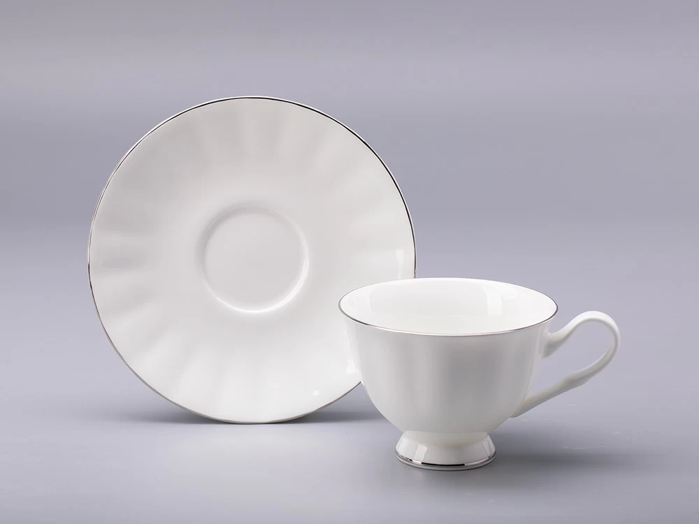 Изделие с рисунком "Платиновая лента" изготовлено на Императорском фарфоровом заводе из костяного фарфора. Изысканная отводка, нанесенная натуральным золотом, деликатно обыгрывает белоснежную поверхность изделий, дополняет легкий, светлый образ, подчеркивает хрупкость материала, изящную форму предметов.