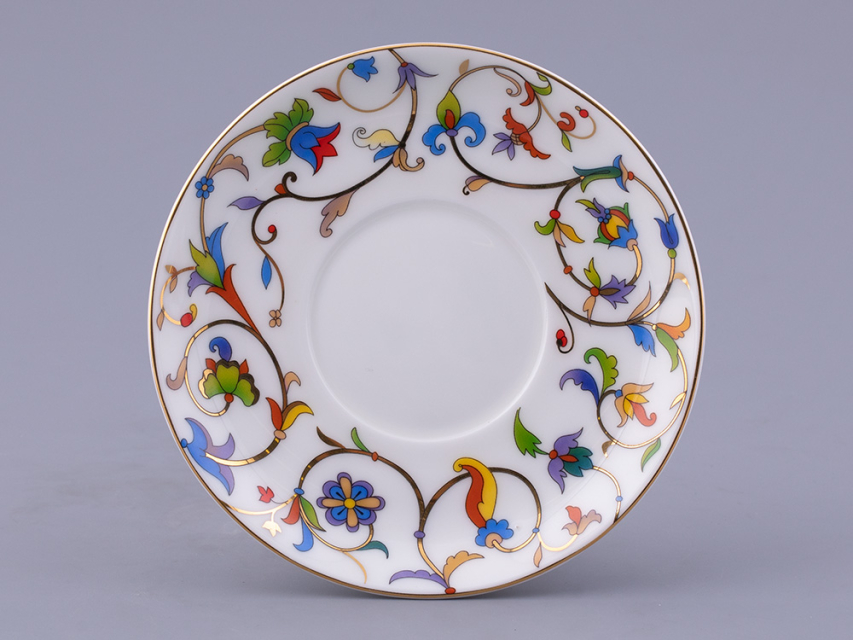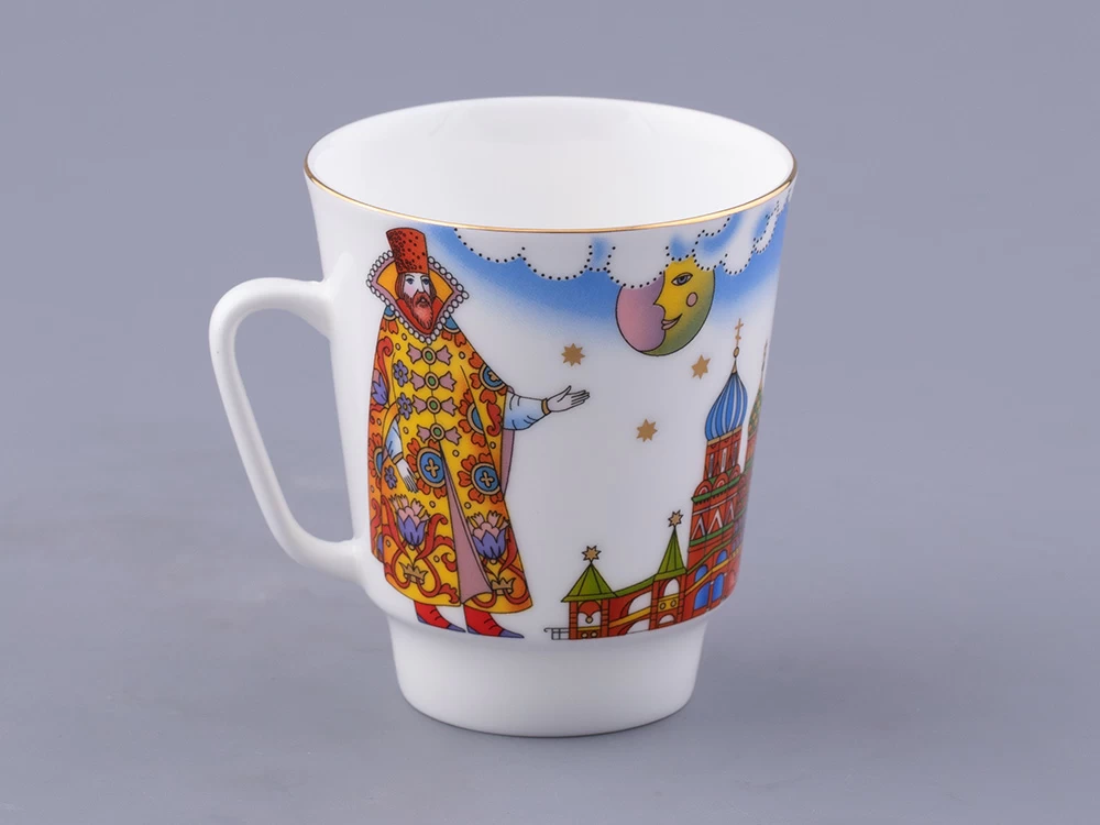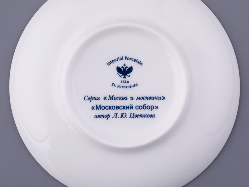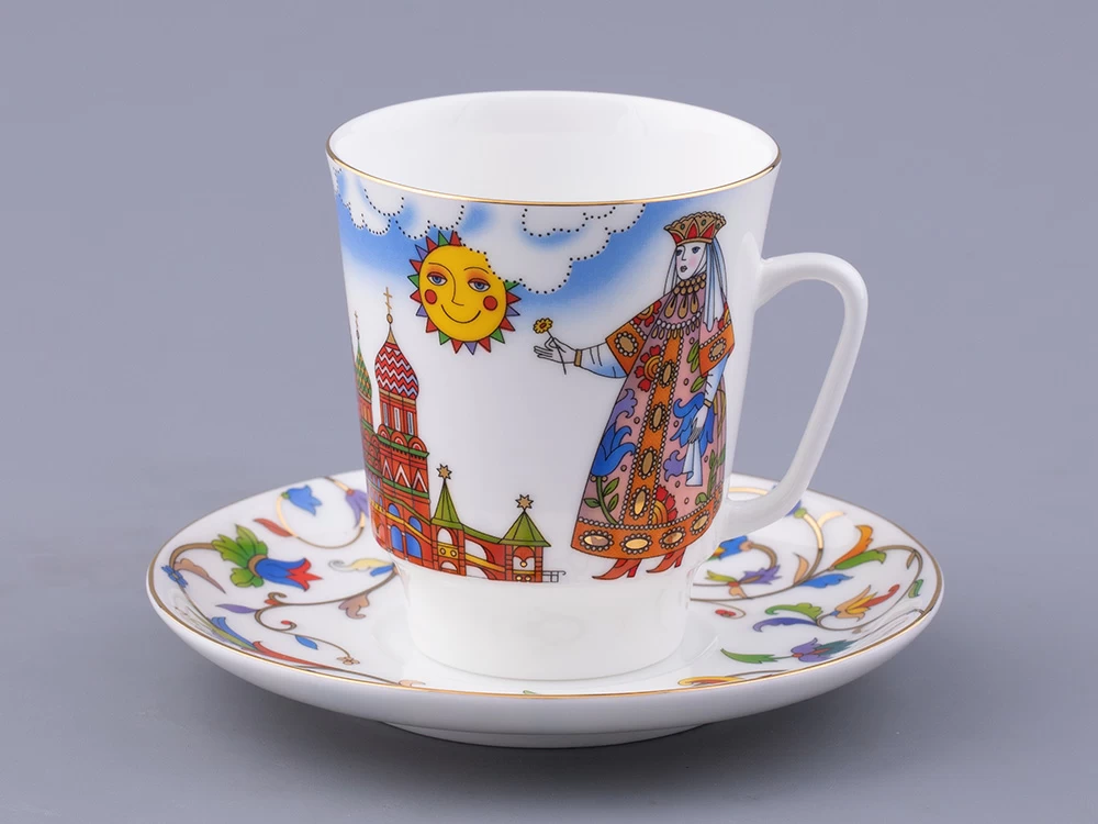 Кофейная пара вошла в серию «Москва и москвичи» от художника Любови Цветковой. Этот рисунок «рассказывает» о столице XVI-XVII века – Москве боярской, дворянской, купеческой. Композиция на фарфоре представляет собирательный образ Москвы тех времен. Собор является отсылкой к Храму Василия Блаженного и традициям московского зодчества. Рисунок на блюдце представляет характерное для того времени растительное узорочье. Персонажи на чашке облачены в яркие, словно театральные, костюмы боярской Руси.