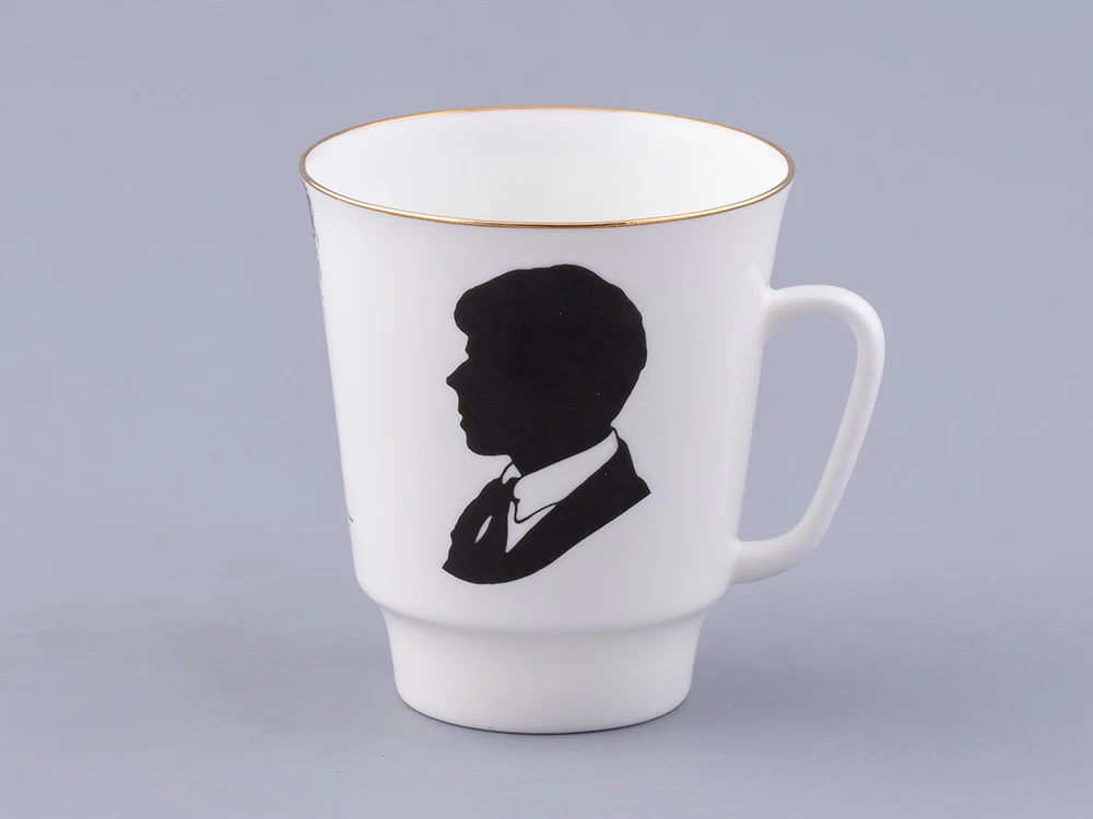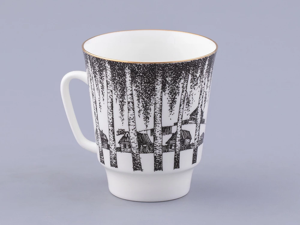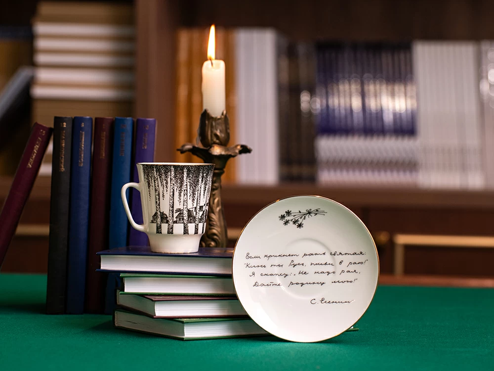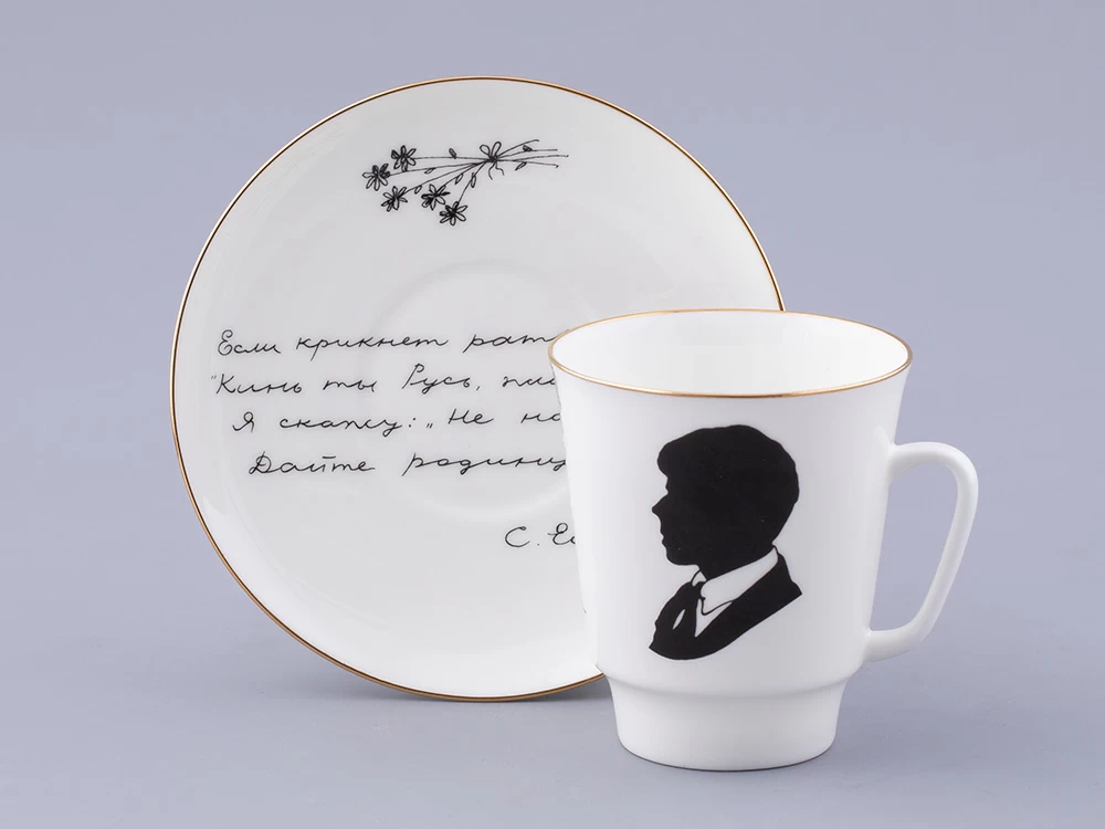На чашке Сергей Соколов изображает силуэт поэта и раскинувшуюся за березовой рощей деревеньку, подчеркивая тему русской деревни в творчестве Есенина.