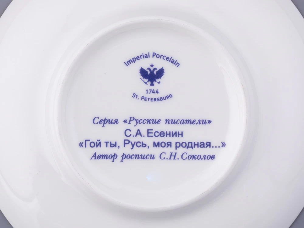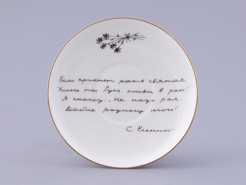 «Певец русской природы» – такое прозвище снискал себе Сергей Есенин. Его творчество наполнено философскими поисками, любовью к Родине и ее невероятным красотам. В 1914 году молодой Есенин пишет лирическое стихотворение «Гой ты, Русь, моя родная!» – настоящее признание в любви родному краю. Строки из этого всем известного произведения художник запечатлел на блюдце: