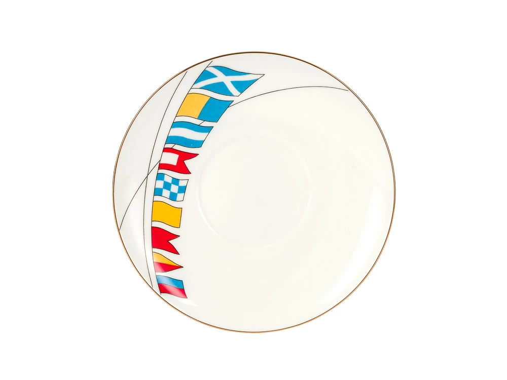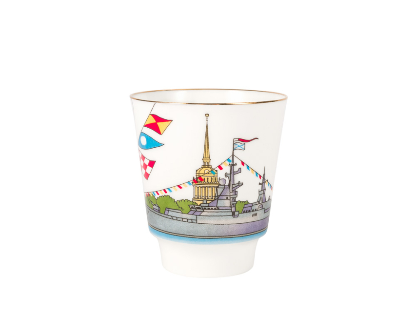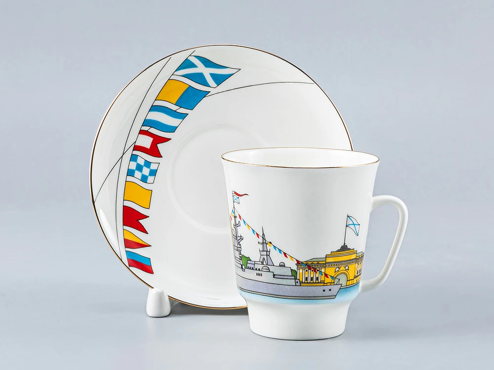День военно-морского флота Российской Федерации отмечается ежегодно в последнее воскресенье июля. Традиция проведения в этот день Главного военно-морского парада в Санкт-Петербурге была восстановлена в 2017 году. Именно это торжественное событие зафиксировала на фарфоре художник Любовь Цветкова: у Адмиралтейской набережной пришвартован военный корабль, над которым торжественно реет Андреевский флаг, и подняты сигнальные флаги. Сигнальные флаги также украсили поверхность блюдца данного комплекта.