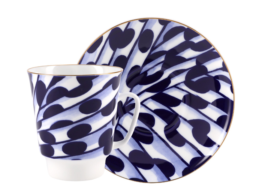 Серия чашек с блюдцами «Настроение» исполнена из тонкостенного костяного фарфора. Коллекция выполнена в монохромной цветовой гамме. Строгие геометрические линии смягчает свободный стиль исполнения. Изделия украшены золотой отводкой.
