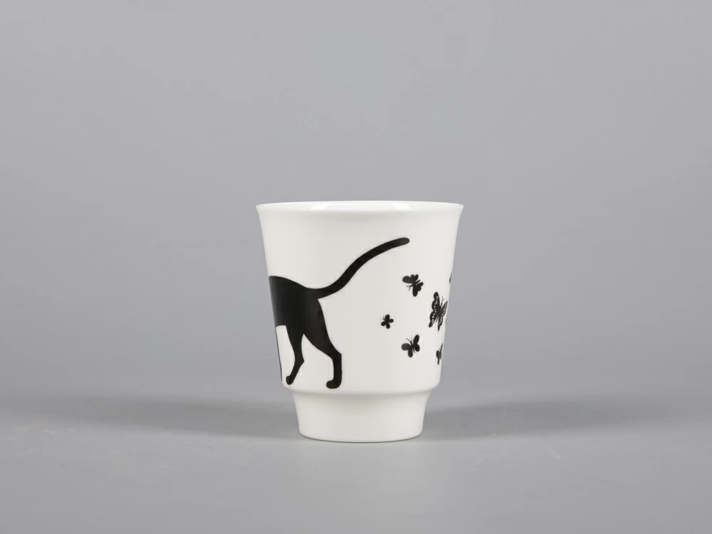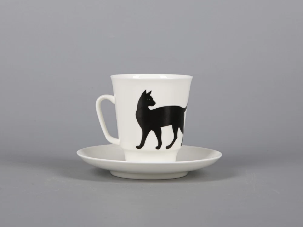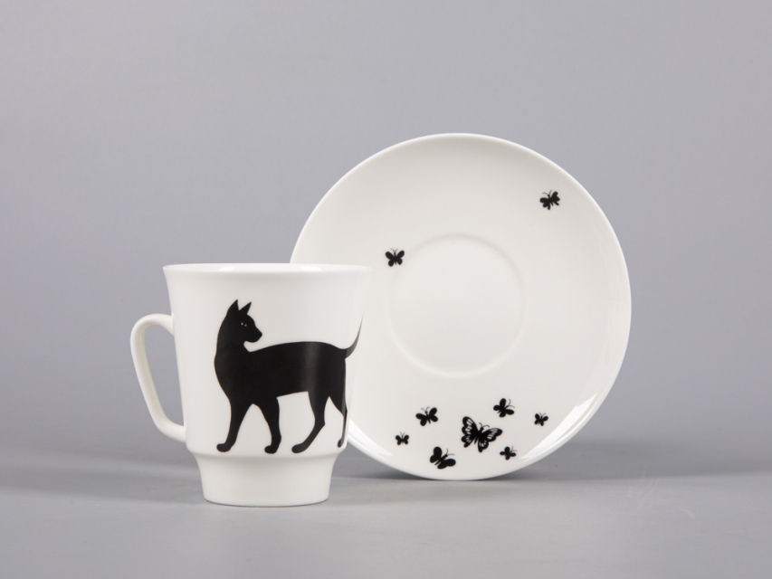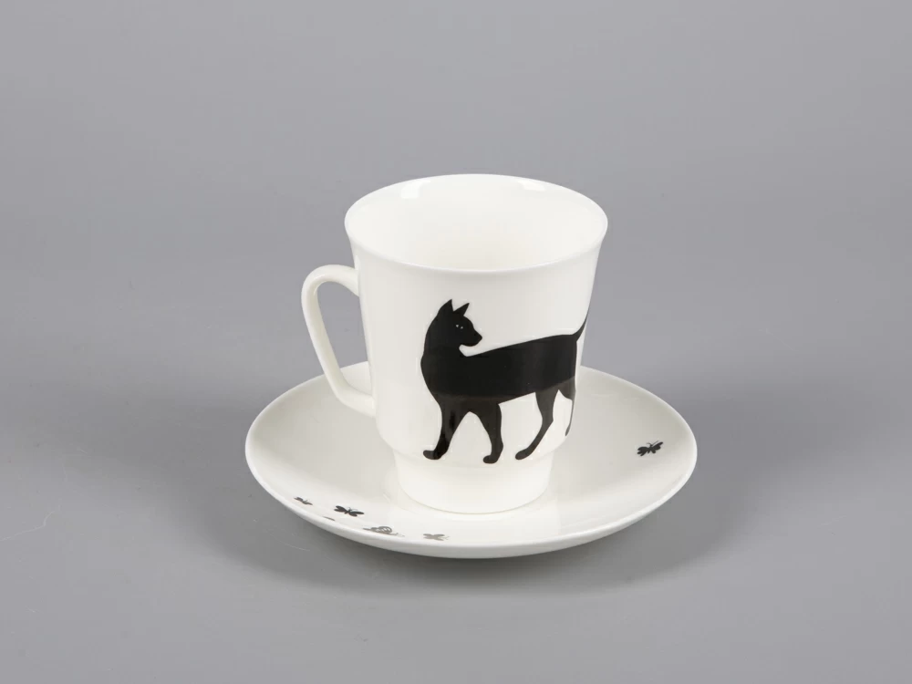Изящная кофейная пара от художника Сергея Соколова. Белоснежная поверхность костяного фарфора стала органичным фоном для очаровательного кота, охотящегося на мышку. Особенностью кофейной пары является лаконичность и самодостаточность рисунка: силуэты выполнены в насыщенном черном цвете, который подчеркивает белизну фарфора и не требует дополнительного декора.