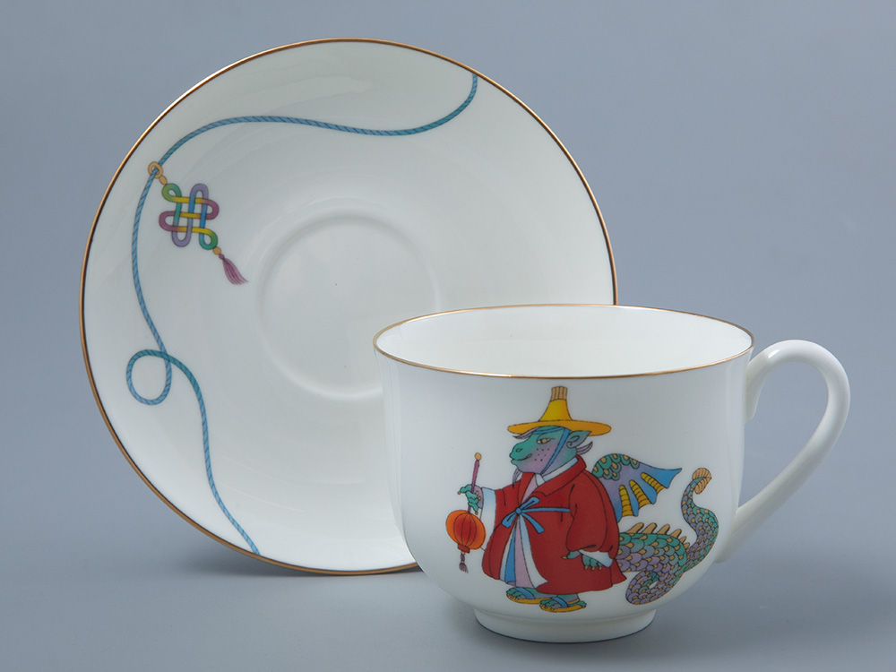 Чайная пара вошла в новогоднюю серию от ведущего художника завода Любови Цветковой. Как и в других своих работах, автор зашифровывает на фарфоре доброе пожелание. Имя дракончика Юн означает «храбрый», облачен он в традиционное китайское одеяние Ханьфу. На блюдце художник изобразила узел на удачу.