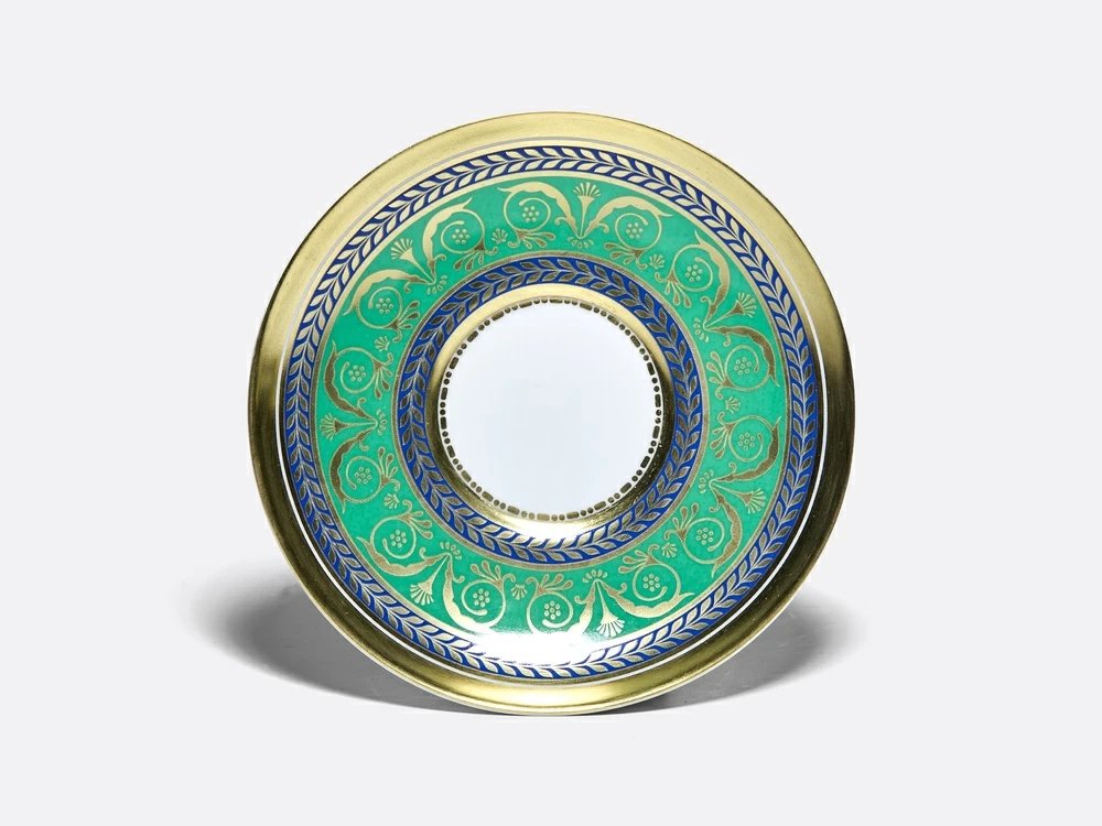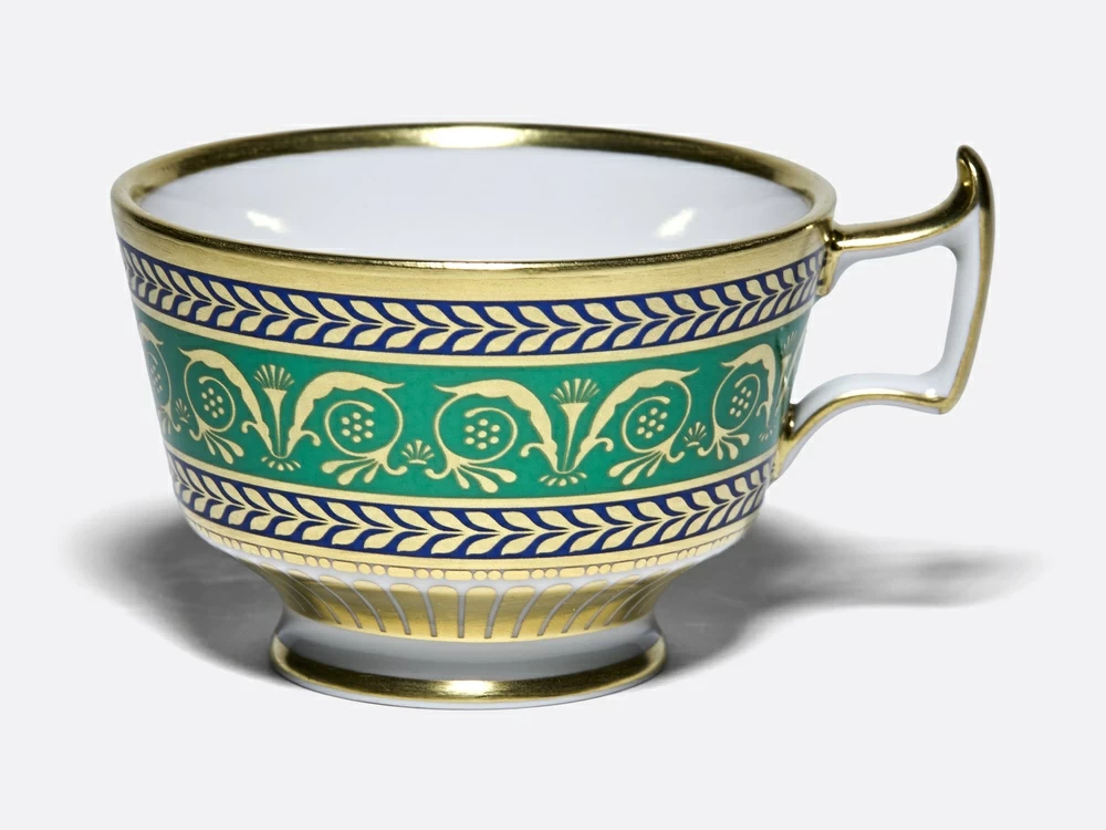 В этом сервизе нашла свое отражение эпоха расцвета Императорского фарфорового завода первой трети XIX века, когда завод изготавливал большие парадные сервизы для дворцов Дома Романовых. В росписи использованы синие и зеленые классические тона, с нанесенным на них изысканным растительным и геометрическим орнаментом. Сервиз богато декорирован натуральным золотом с филигранной гравировкой. Изобилие золота в росписи дало сервизу, изначально именованному «Гербовый», второе название – «Золотой».