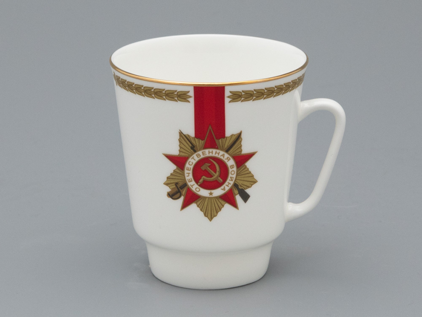 Кофейная пара украшена изображением ордена Отечественной войны I степени. Изображение ордена на чашке сопровождается муаровой лентой цвета бордо с красной полоской посередине, а также юбилейной надписью.