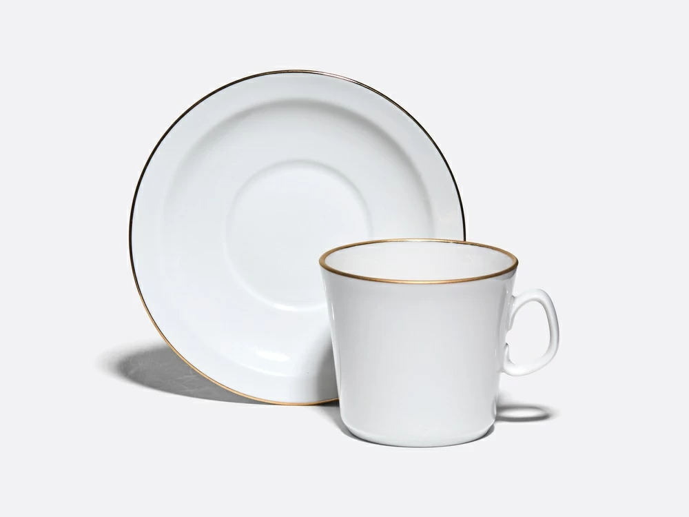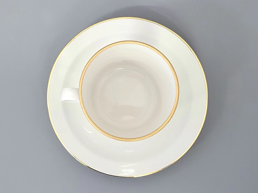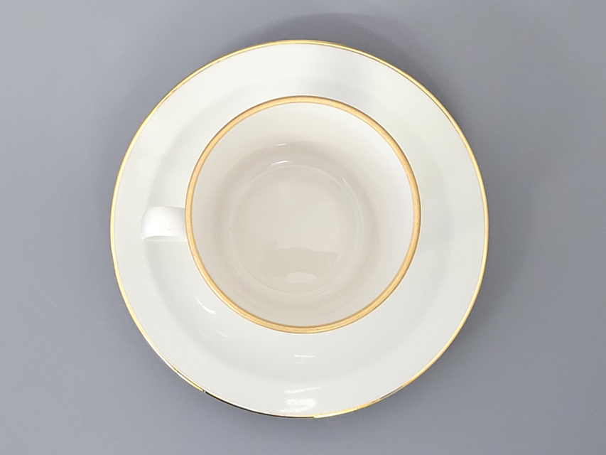 Чашка с блюдцем изготовлена на Императорском фарфоровом заводе из твердого фарфора. Для декорирования используется отводка золотом. Объем чашки - 115 мл, высота - 5.8 см, диаметр блюдца - 10 см. Обратите внимание, объем измеряется от дна до верхнего края изделия, полезный объем может быть на 10-15% меньше заявленного производителем.