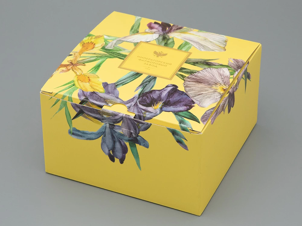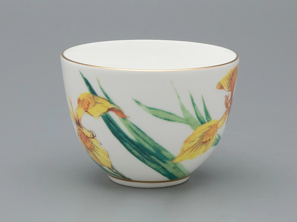 Миниатюрный ирис «Лесной свет» отличается от своих «собратьев» мягким желтым оттенком лепестков. Татьяна Чапургина мастерски передает игру света, используя плавные переходы от бледно-лимонного тона к более насыщенным медовым и янтарным полутонам. Эффект солнечного свечения подчеркивает желтый цвет блюдца. Оно не только гармонирует с изображением на чашке, но и придает костяному фарфору дополнительную воздушность. Завершающим штрихом является подарочная упаковка, созданная специально для этой серии.