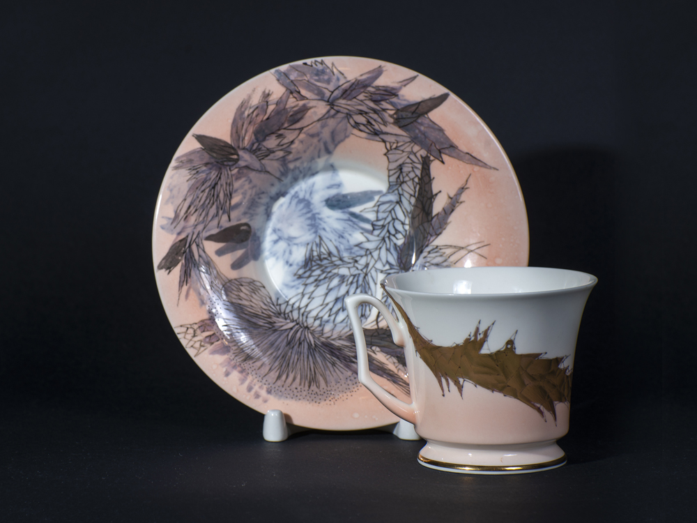 "Растительная тематика – одна из любимых в творчестве Татьяны Чапургиной. Чайная пара вошла в серию «Русские обочины», которую художник посвятила разнообразию отечественной флоры Неприхотливые растения, среди которых – степная колючка и репейник, растущие по обочинам и на пустырях, стали главными героями серии.