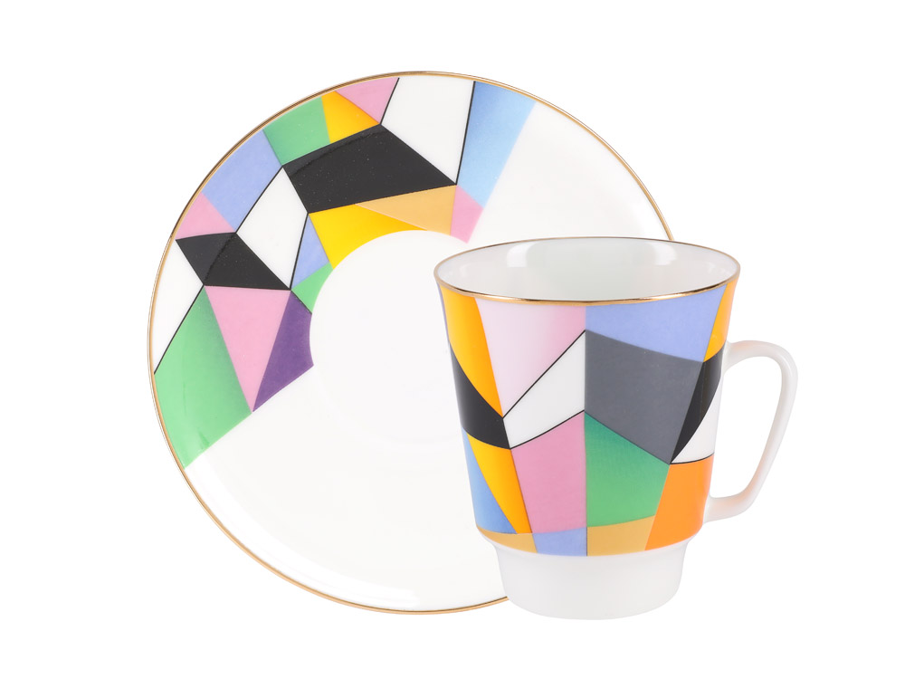 Декор коллекции "Движение" разработан современным художником Императорского фарфорового завода Верой Бакастовой в супрематической традиции. На поверхности фарфора автор строит абстрактные геометрические композиции из разнообразных по форме объектов ярких чистых цветов.
