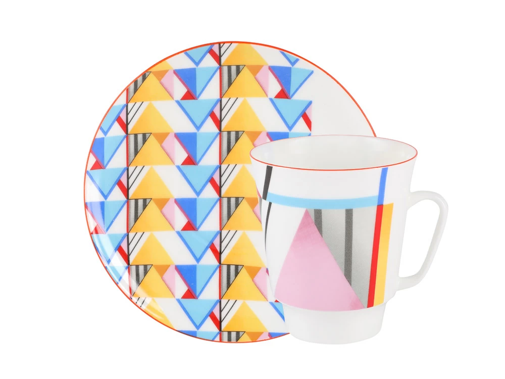 Декор коллекции "Движение" разработан современным художником Императорского фарфорового завода Верой Бакастовой в супрематической традиции. На поверхности фарфора автор строит абстрактные геометрические композиции из разнообразных по форме объектов ярких чистых цветов.