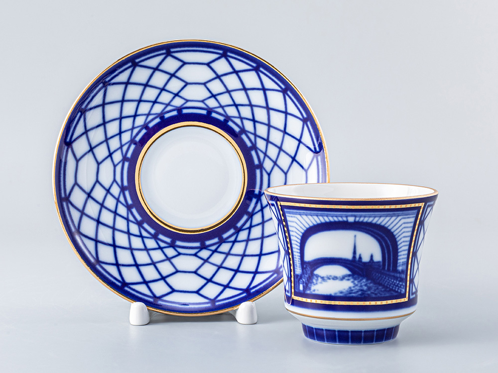 Чашка с блюдцем чайная рис. Эрмитажный мост изготовлена на Императорском фарфоровом заводе из твердого фарфора с элементами ручной росписи. Автор рисунка - Шуляк Г.Д. Объем изделия - 220 мл.