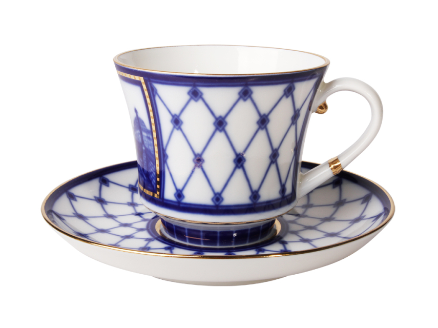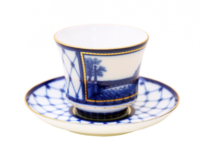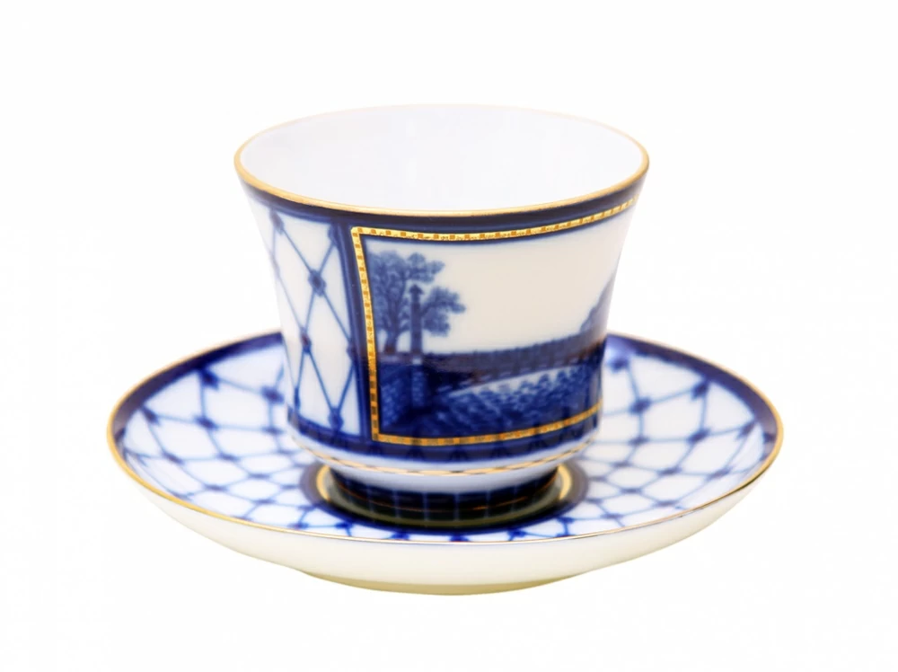 Чашка с блюдцем чайная рис. Мост Пестеля изготовлена на Императорском фарфоровом заводе из твердого фарфора с элементами ручной росписи. Автор рисунка - Шуляк Г.Д. Объем изделия - 220 мл.