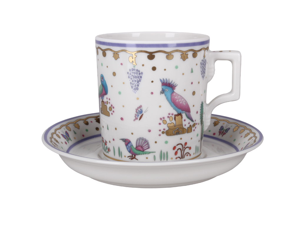 За основу росписи художник взял одно из своих графических произведений, перенеся на фарфор сказочные видения: древо с плодами винограда, фантастических бабочек и экзотических птиц с ярким оперением, восседающих на ветвях или небольших золоченых помостах. Художник словно отвлекся от «насущного» и устремился мечтами в райский сад.