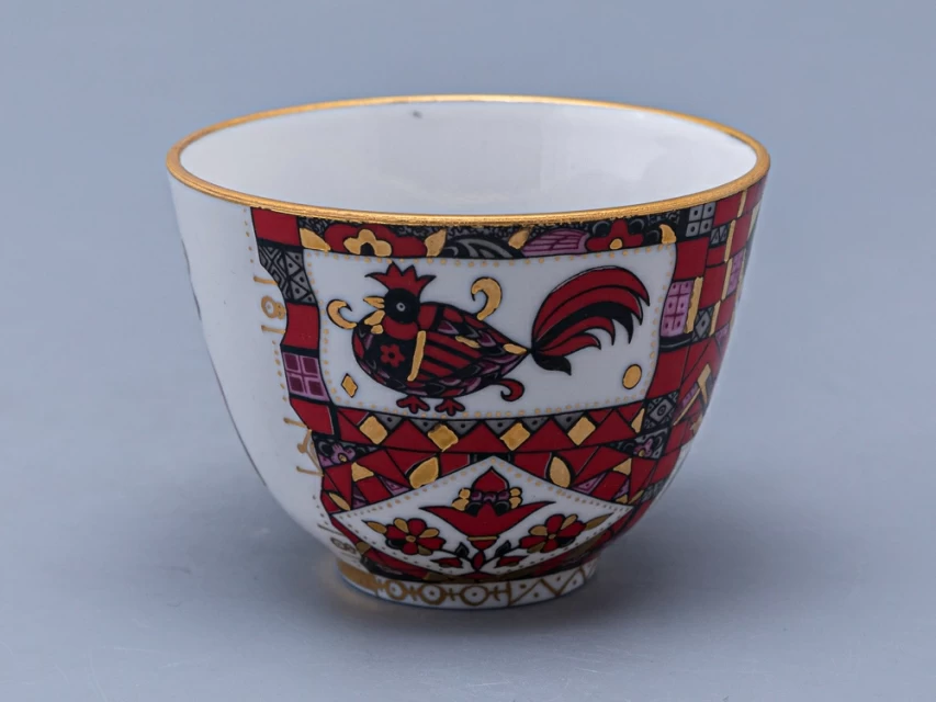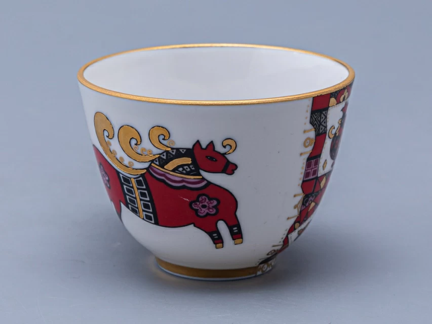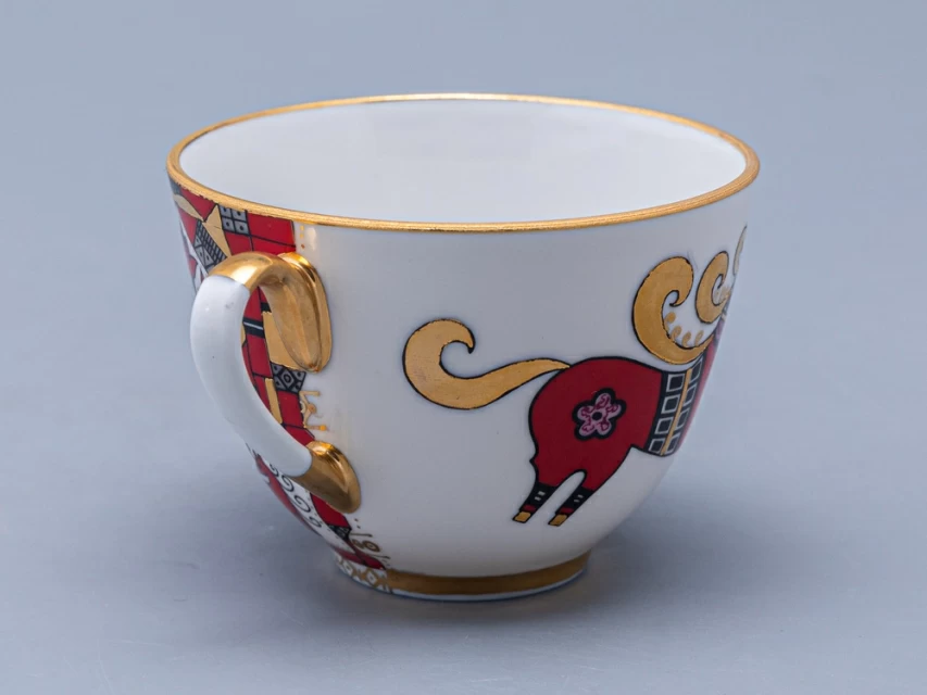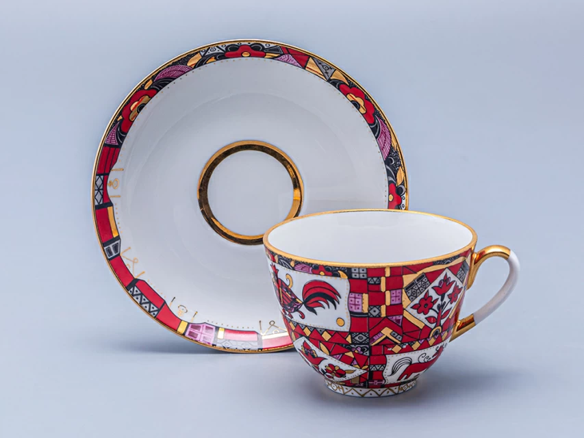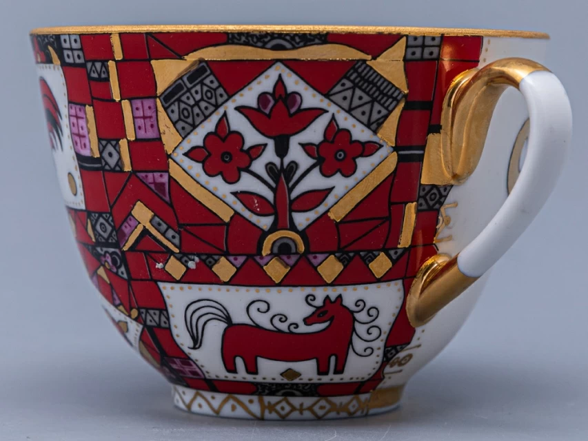 Художественное оформление чайной пары создано выдающимся художником Алексеем Воробьевским (1906-1992), творчество которого – это чудесные фантазии, сказочные пейзажи и волшебство. Также художник обращался к нарядным мотивам русского народного искусства, переосмысливал элементы древнерусского орнамента. В результате Алексей Воробьевский разработал собственный самобытный «русский» стиль с яркой цветовой палитрой и точной прорисовкой деталей, что прекрасно демонстрирует чайная пара с «Красный конь».