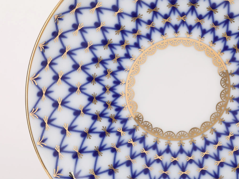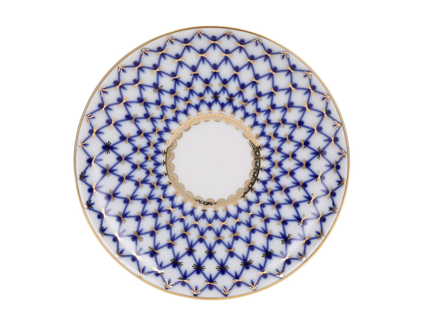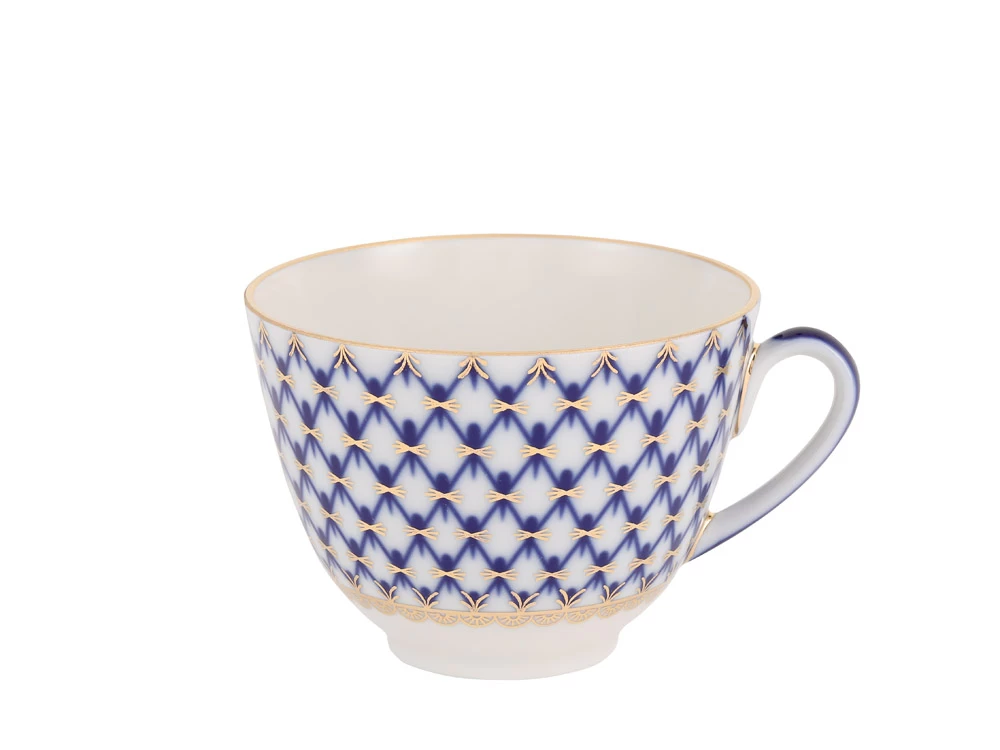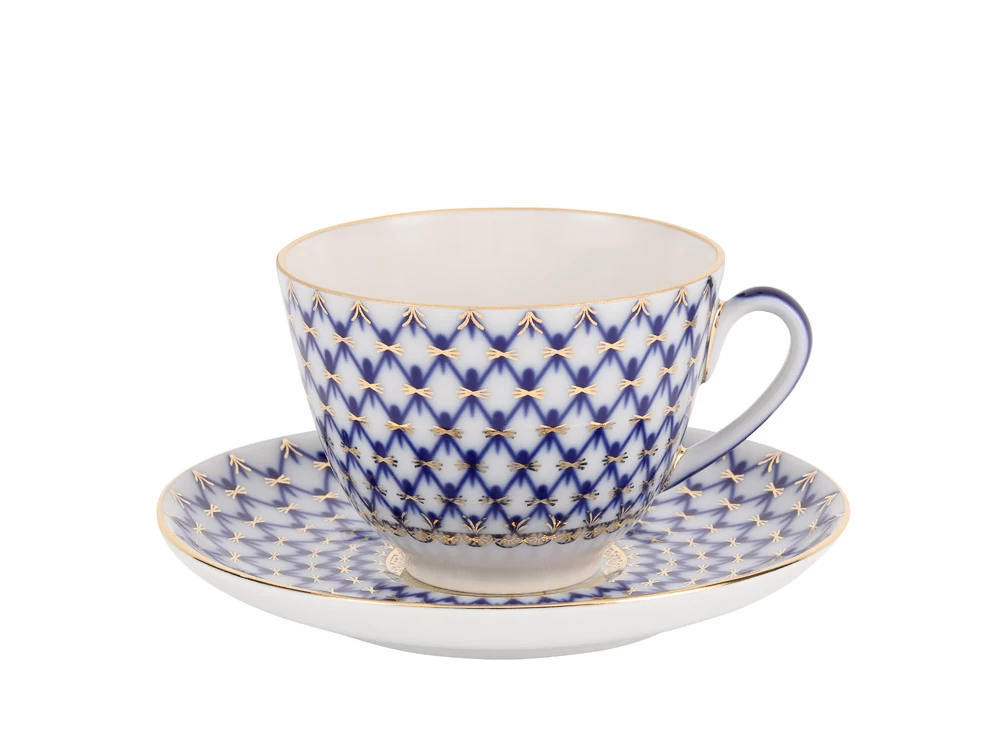 Чашка с блюдцем чайная рис. Кобальтовая сетка изготовлена на Императорском фарфоровом заводе из твердого фарфора с отводкой золотом вручную. Автор формы - Яковлева С.Е. Автор рисунка - Яцкевич А.А. Объем изделия - 250 мл.