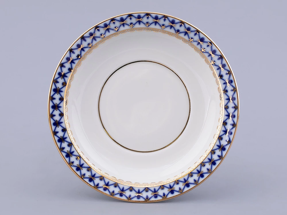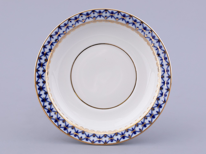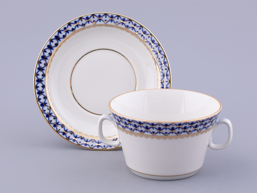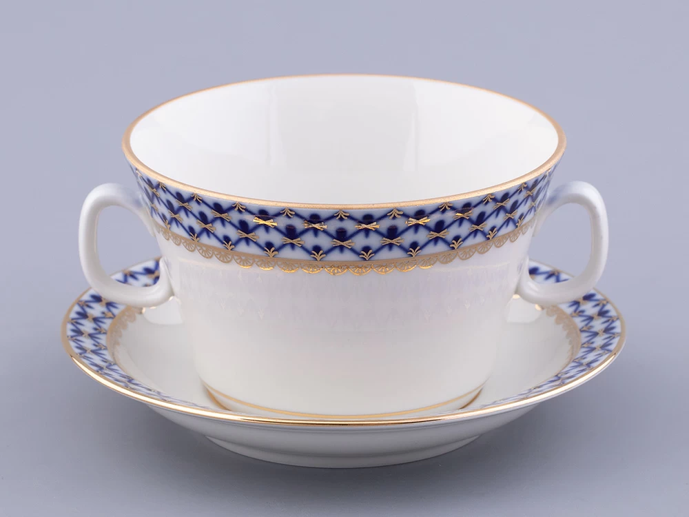 Чашка с блюдцем бульонная рис. Кобальтовая сетка изготовлена на Императорском фарфоровом заводе из твердого фарфора с элементами ручной росписи. Автор рисунка - Яцкевич А.А. Объем изделия - 360 мл.