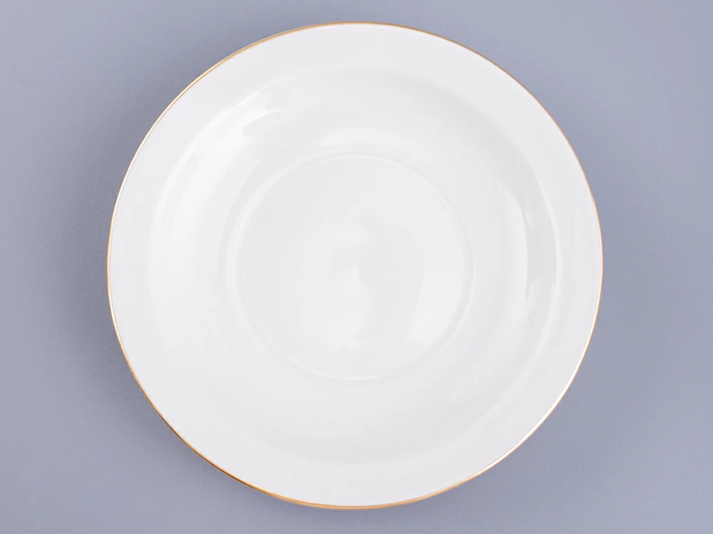 Изделие с рисунком "Золотая лента" изготовлено на Императорском фарфоровом заводе из костяного фарфора. Изысканная отводка, нанесенная натуральным золотом, деликатно обыгрывает белоснежную поверхность изделий, дополняет легкий, светлый образ, подчеркивает хрупкость материала, изящную форму предметов.