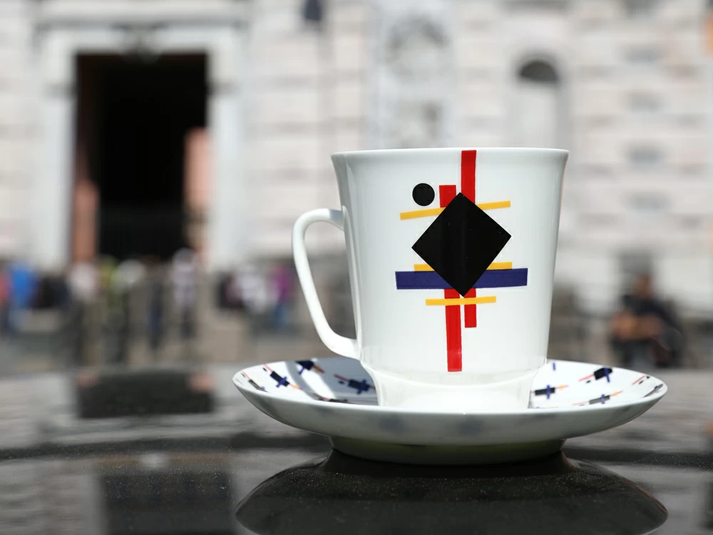Декор вдохновлен авангардным искусством, основоположником которого был Казимир Малевич. Геометрические абстракции с четкими линиями квадратов, круго,. прямоугольников, контрастными цветами (черным, красным, желтым) создают выразительную динамичную композицию. Техника точечной росписи и глянцевая глазурь делают рисунок живым и гармоничным. Кофейная пара станет достойным подарком для ценителей современного искусства и коллекционеров, а также для всех, кому нравятся стильные аксессуары для утреннего кофе. Можно купить кофейную чашку с блюдцем в качестве приятного презента близкому человеку или порадовать себя красивой, долговечной изысканной посудой.