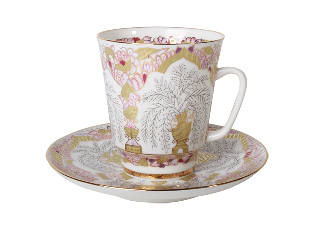 Чашка с блюдцем кофейная рис. Золотые вазочки изготовлена на Императорском фарфоровом заводе из костяного фарфора с применением только ручной росписи. Автор рисунка - Воробьевский А.В. Объем изделия - 165 мл.