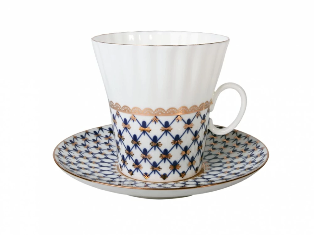 Чашка с блюдцем кофейная рис. Кобальтовая сетка изготовлена на Императорском фарфоровом заводе из костяного фарфора с элементами ручной росписи. Автор рисунка - Яцкевич А.А. Объем изделия - 175 мл.