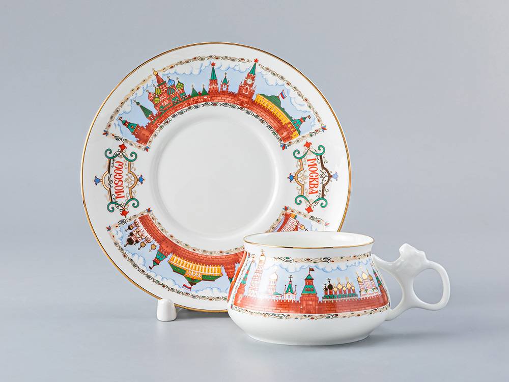 Роспись выполнена в технике надглазурной живописи надглазурными красками и золотосодержащим препаратом. По тулову чашки и борту блюдца в золотых орнаментальных рамках изображена панорама Московского Кремля с видом на Кремлевский дворец, Успенский и Архангельский соборы, Храм Христа-Спасителя и другие памятники архитектуры Московского Кремля. По центру чашки напротив ручки изображен Герб Москвы. На блюдце надпись «Москва» на русском и английском языках. Кистью вручную нанесена отводка золотосодержащим препаратом по краю чашки и блюдца.