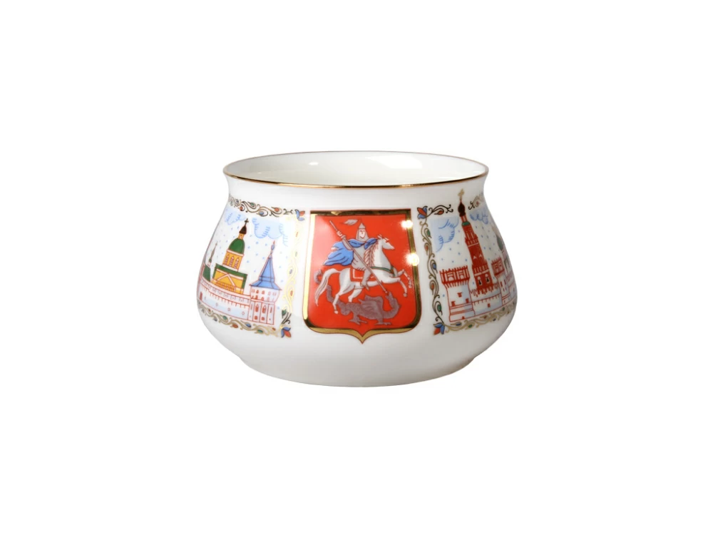 Под зимним небом художница стилистически изобразила главные достопримечательности златоглавой Москвы. Чашка украшена московским гербом, на котором Святой Георгий Победоносец пронзает копьем змея.