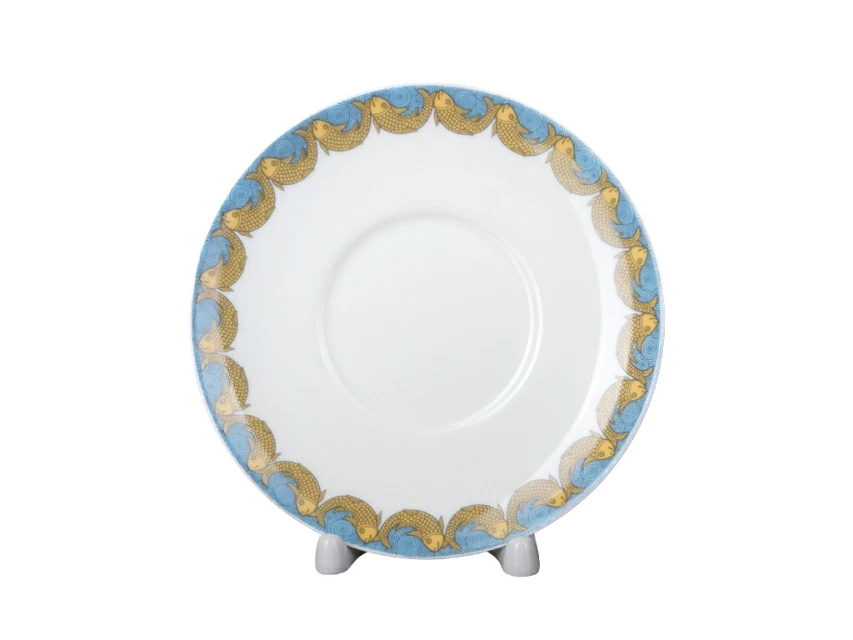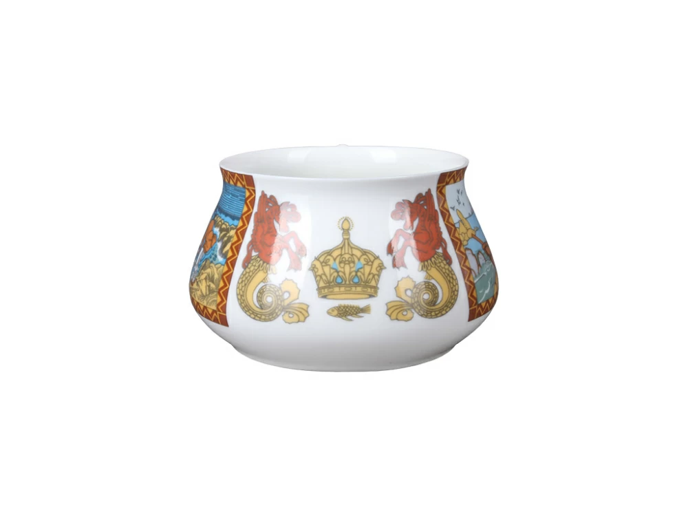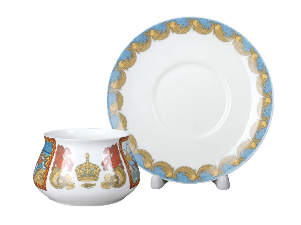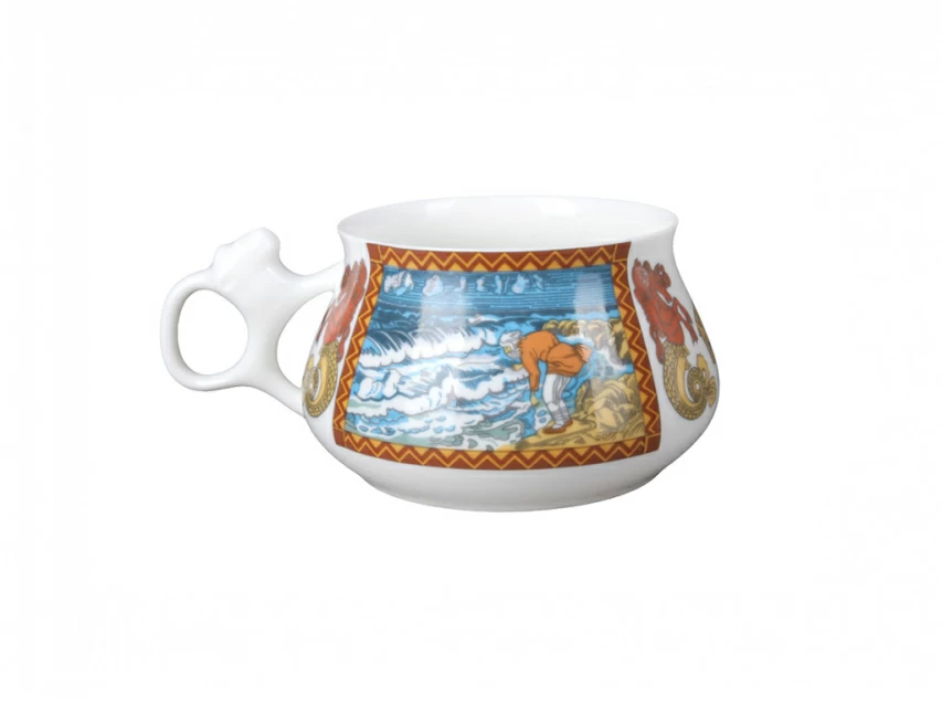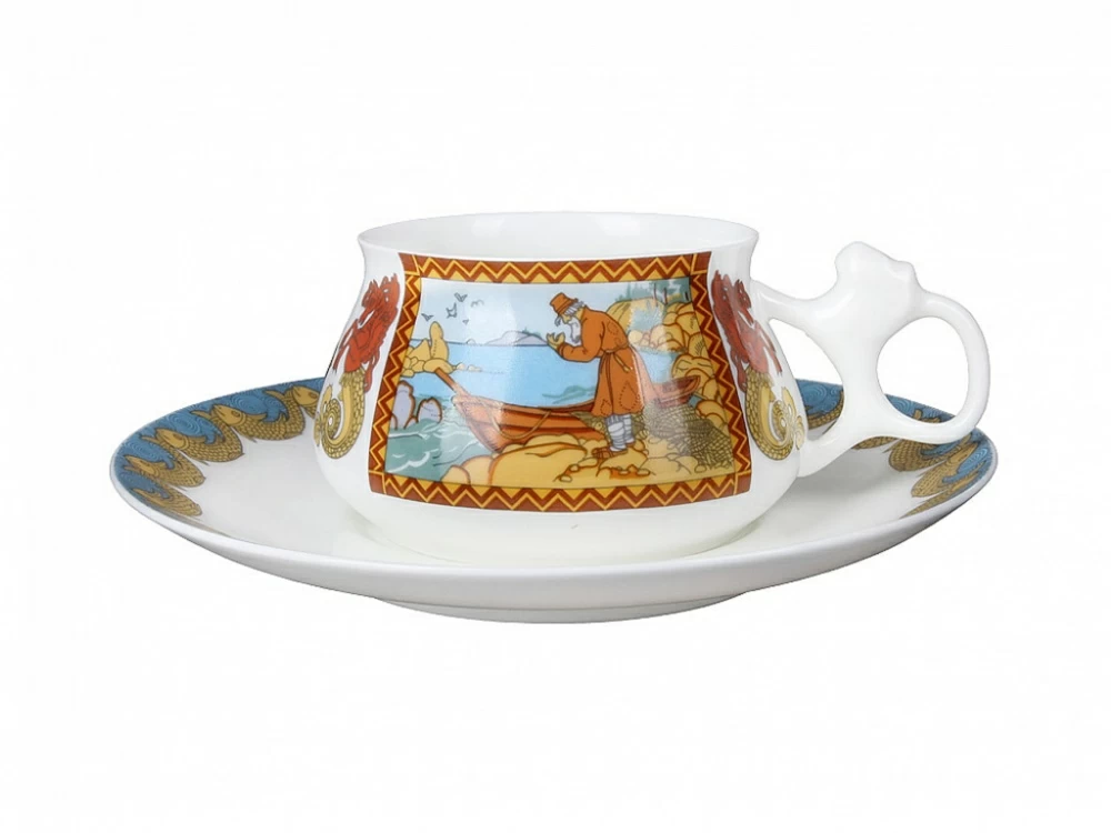На чашке с блюдцем «Сказка о рыбаке и рыбке» изображен сюжет произведения А.С.Пушкина, перенесенный на фарфор по мотивам книжной графики выдающегося художника И.Я. Билибина. В росписи чайной пары доведенная до совершенства и выдержанная стилистика «облагороженного лубка» созвучна образному строю литературного первоисточника. Красота узорного рисунка, изысканная декоративность цветовых сочетаний, тонкое зрительное воплощение мира, сочетание яркой сказочности с чувством народного юмора воссоздают красочный мир отечественной старины и фольклора.