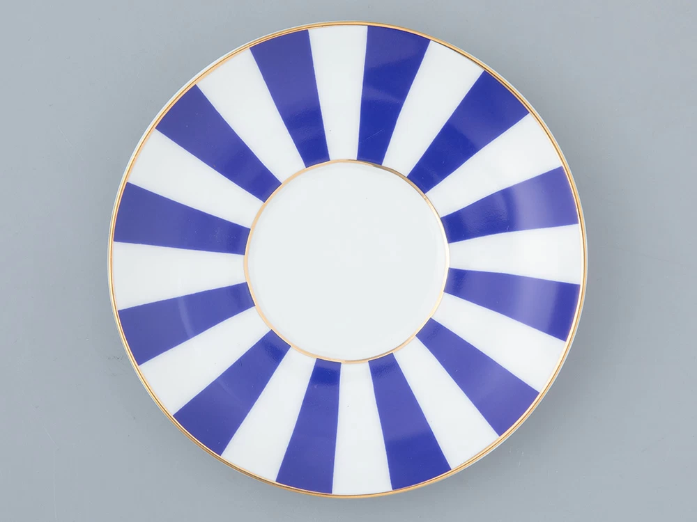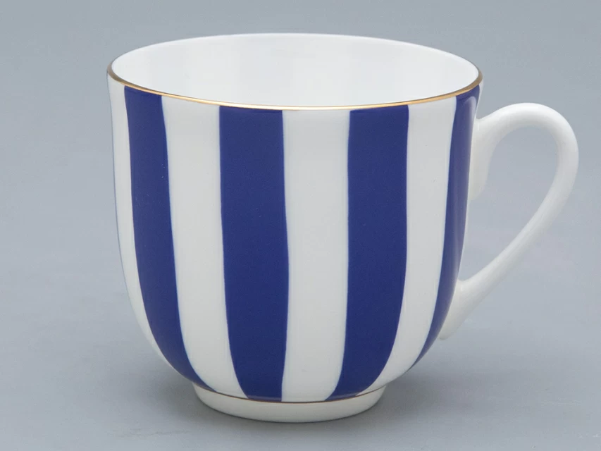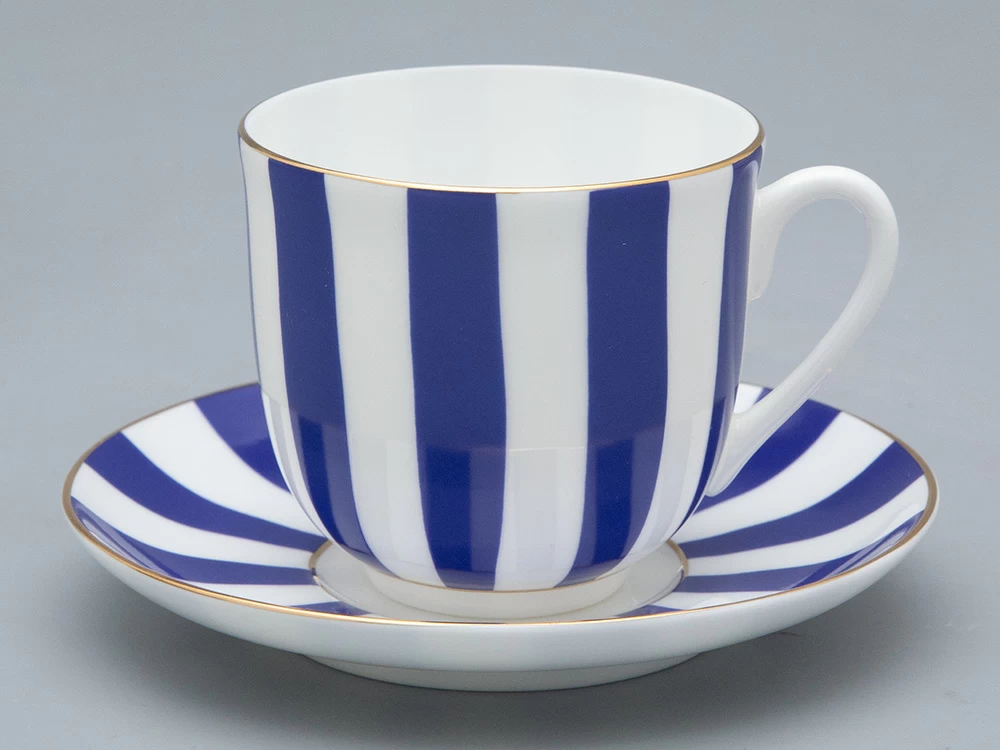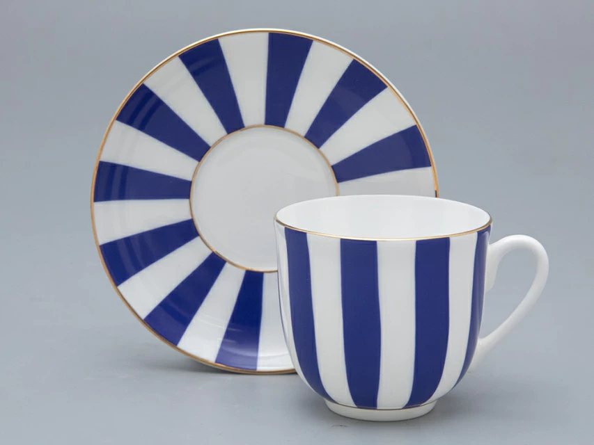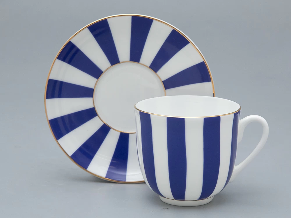 Чашка с блюдцем кофейная рис. "Да и Нет" на форме "Ландыш" изготовлена из костяного фарфора. Для декорирования используется надглазурная деколь, отводка золотом. Автор росписи - художник Императорского фарфорового завода Сергей Соколов, форма восстановлена по музейному образцу. Изделие впервые поступило в продажу в 2002 году. Роспись серии чашек «Да и нет» гениально проста: ритмичное чередование белых и цветных полос. Белый цвет – это цвет самого материала. Дополнительный тон выбран художником не случайно: он должен составлять с фарфоровым фоном гармоничный контраст и динамику.