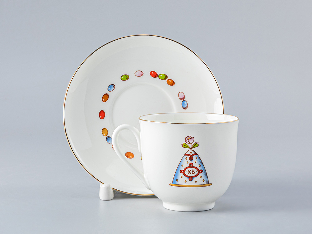 Традиция изготовления изысканных подарков, как дань одному из важнейших православных праздников – Пасхе, была заложена на Императорском фарфоровом заводе ещё в XVIII веке. В настоящее время художники завода продолжают эту славную традицию. Любовь Цветкова выбрала необычную форму для этого подарка – чашку с блюдцем. Очаровательный комплект украшен пасхальными угощениями – куличом и пасхой, исполненными в декоративной, условной манере. Изображения на чашке перекликаются с ярким орнаментом на блюдце, выполненным в виде гирлянды разноцветных пасхальных яиц, обрамляющей основание чашки. Такая удивительная чайная пара – отличное украшение пасхального стола и приятный подарок Вашим родным и близким для особенного настроения в этот светлый праздник.