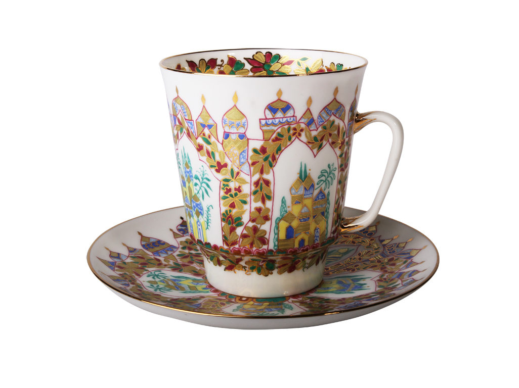 Чашка с блюдцем кофейная рис. Дворцы Шехерезады изготовлена на Императорском фарфоровом заводе из костяного фарфора с применением только ручной росписи. Автор рисунка - Воробьевский А.В. Объем изделия - 165 мл.