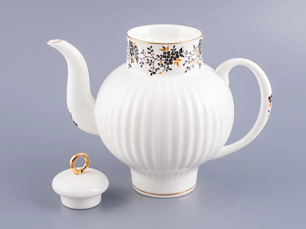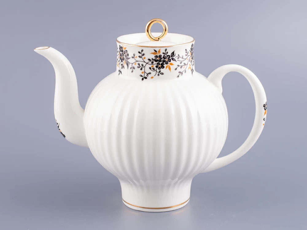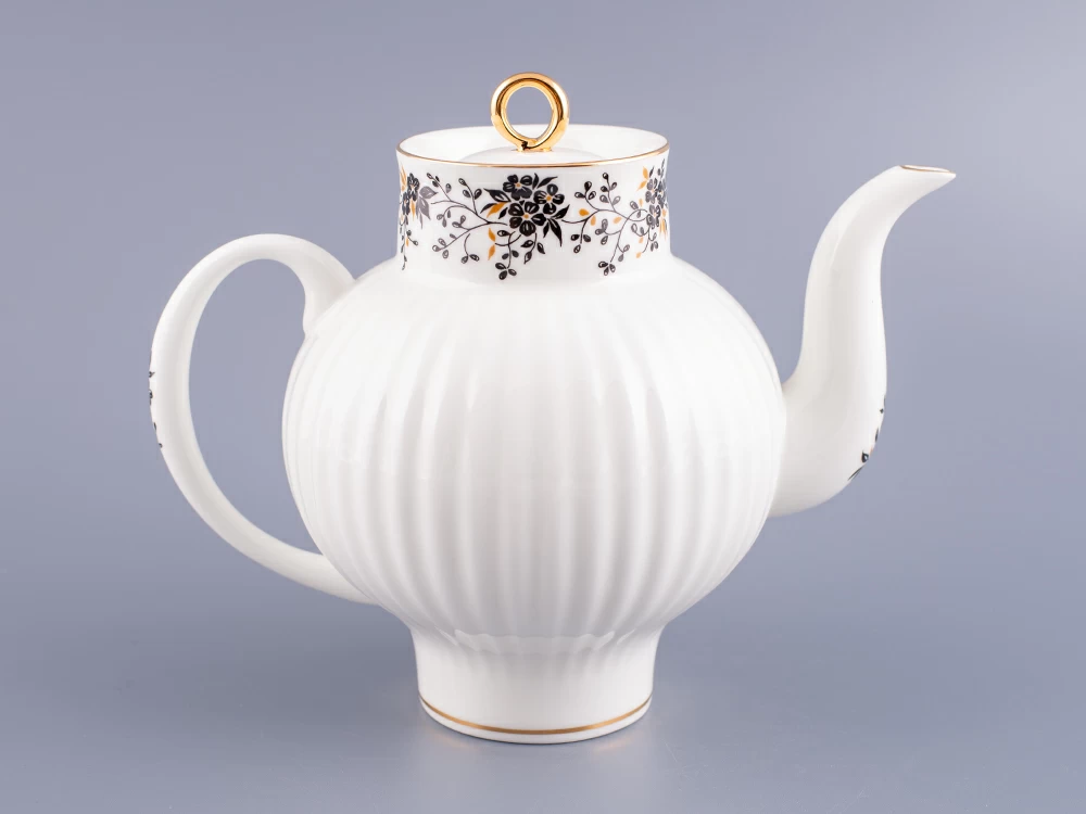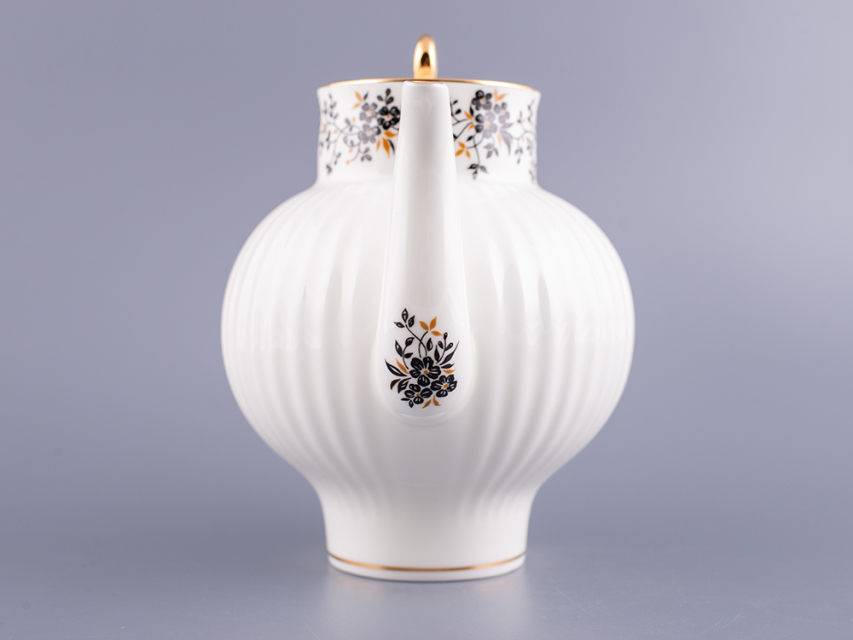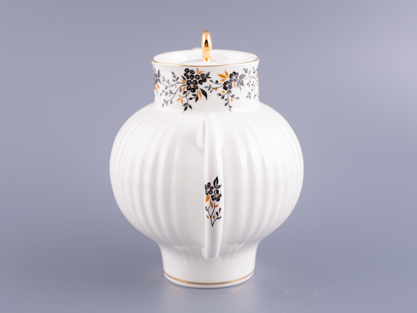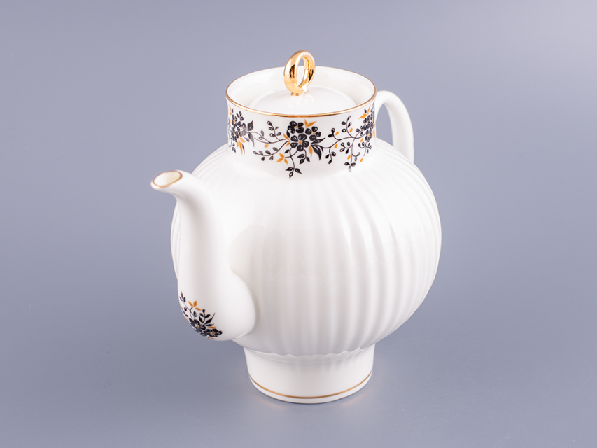 Роспись изделий выполнена в технике надглазурной живописи надглазурными красками с ручной доделкой и отводкой золотом.По верху чайника изображены мелкие черные цветочки на тонких веточках с маленькими черными и золотистыми листочками.