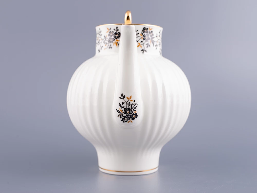 По внутреннему краю и по ножке чайника изящная отводка золотом. По носику чайника тонкая отводка золотом.
