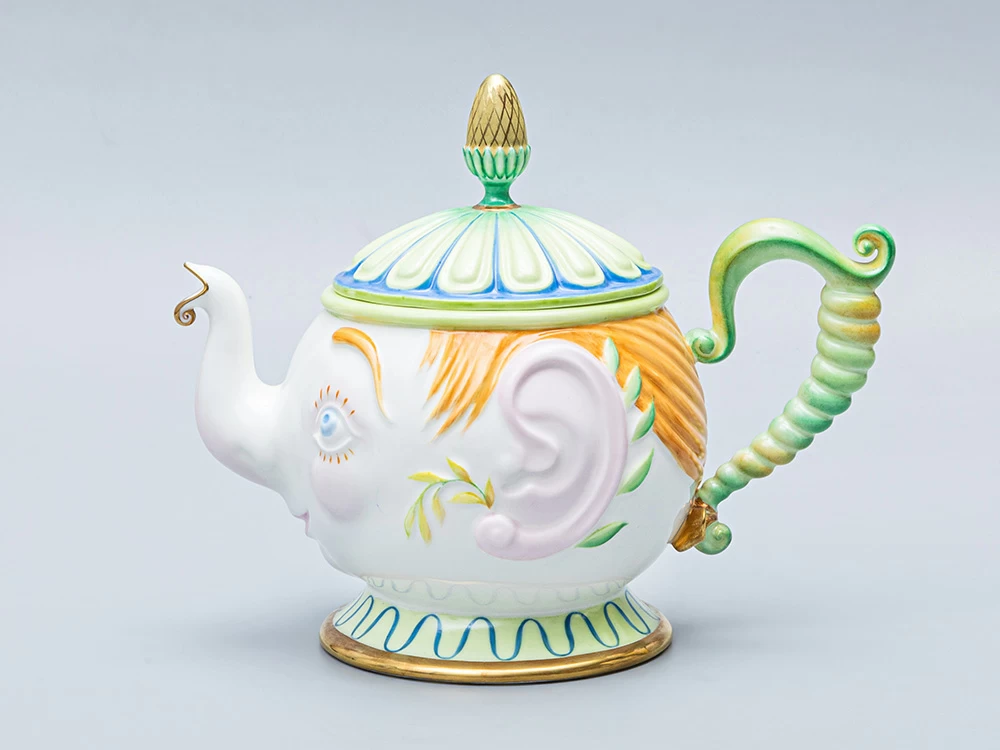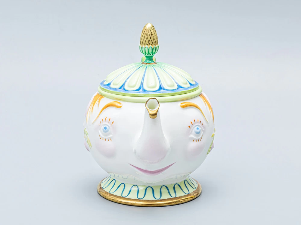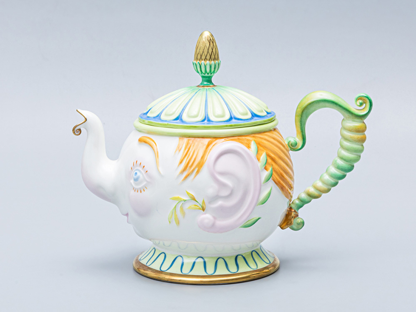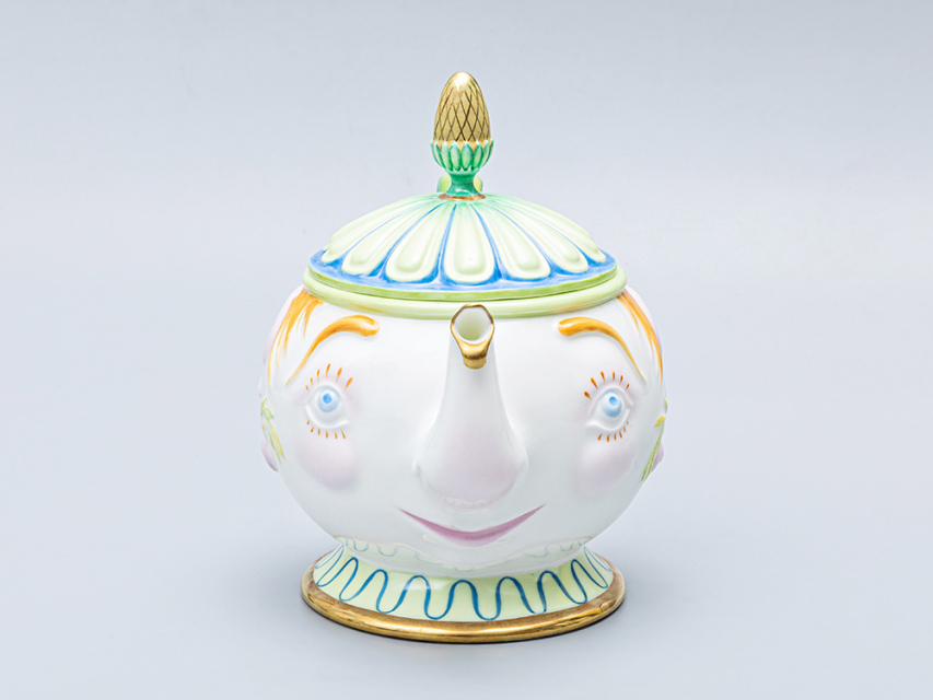 Роспись выполнена в технике надглазурной живописи надглазурными красками и золотосодержащим препаратом. Чайник выполнен в виде человеческой головы, носик чайника – виде хобота слоненка. Ручка имеет вид заплетенной вверх китайской косички с небольшим бантиком. Ножка чайника представляет собой воротник одежды, крышка – нарядная «шапочка». По бокам изделия большие рельефные уши. Изделие подписное.