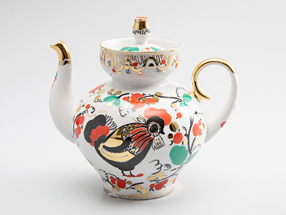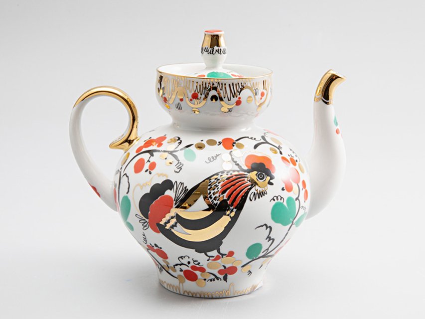 Чайник заварной рис. Петушки изготовлен на Императорском фарфоровом заводе из твердого фарфора с элементами ручной росписи. Автор рисунка - Григорьева Л.И. Объем изделия - 600 мл. Форма "Бутон" создана в 1972 году Борисовым А.И.Рисунок "Петушки" для этой формы был создан в 1972 году Григорьевой Л.И.