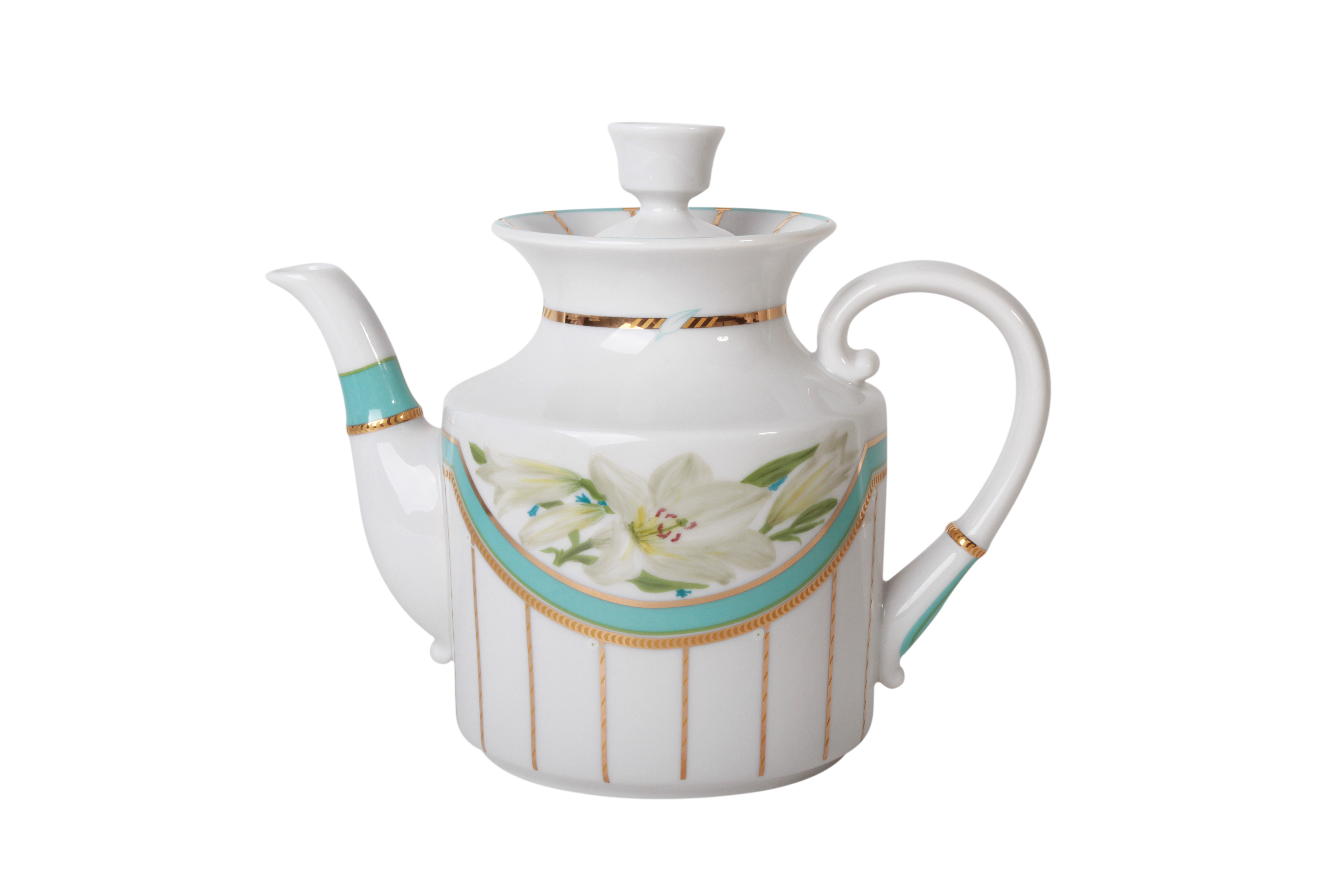 В росписи представленного чайника «Аврора» художник Нелли Львовна Петрова использовала тонкий цветочный живописный узор. Нежные цветы в сочетании с изысканным декором на благородной форме – настоящая классика фарфорового искусства. Небесно-голубые полосы на сервизных предметах, соединенные лаконичным орнаментом и дополненные золотыми графическими украшениями, создают легкий, светлый образ вещи, подчеркивают изящество и благородство утонченного материала.